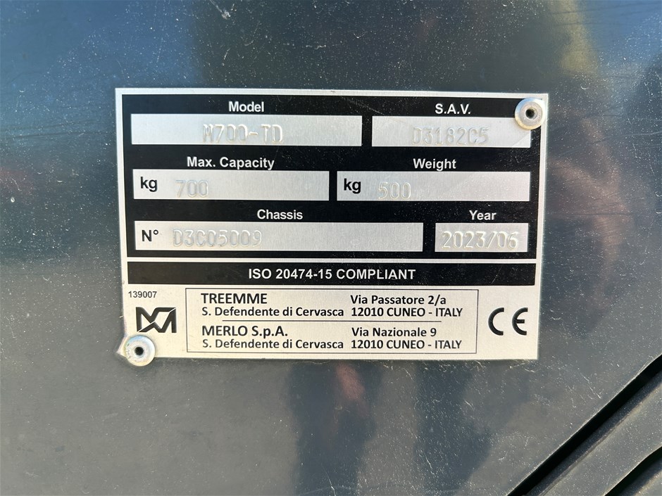 • Comments: Manufacturer: MerloModel: M700-TDYear: 2023/06S.A.V: D3182C5Max Capacity: 700kgWeight: 500kgEngine Manufacturer: HondaEngine Model: GX 390Engine Size: 389ccOwners Manual: Yes Service History: NoLast Service Record: Sticker shows last service on 23/09/2025 at 318 hours