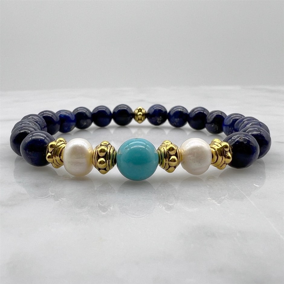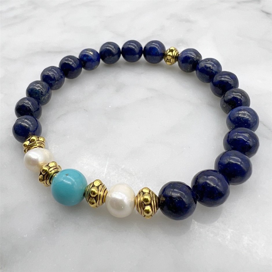 Natural Lapis Lazuli, Turquoise, Freshwater Pearls Stretchy & Antique Gold Spacers Beaded Bracelet