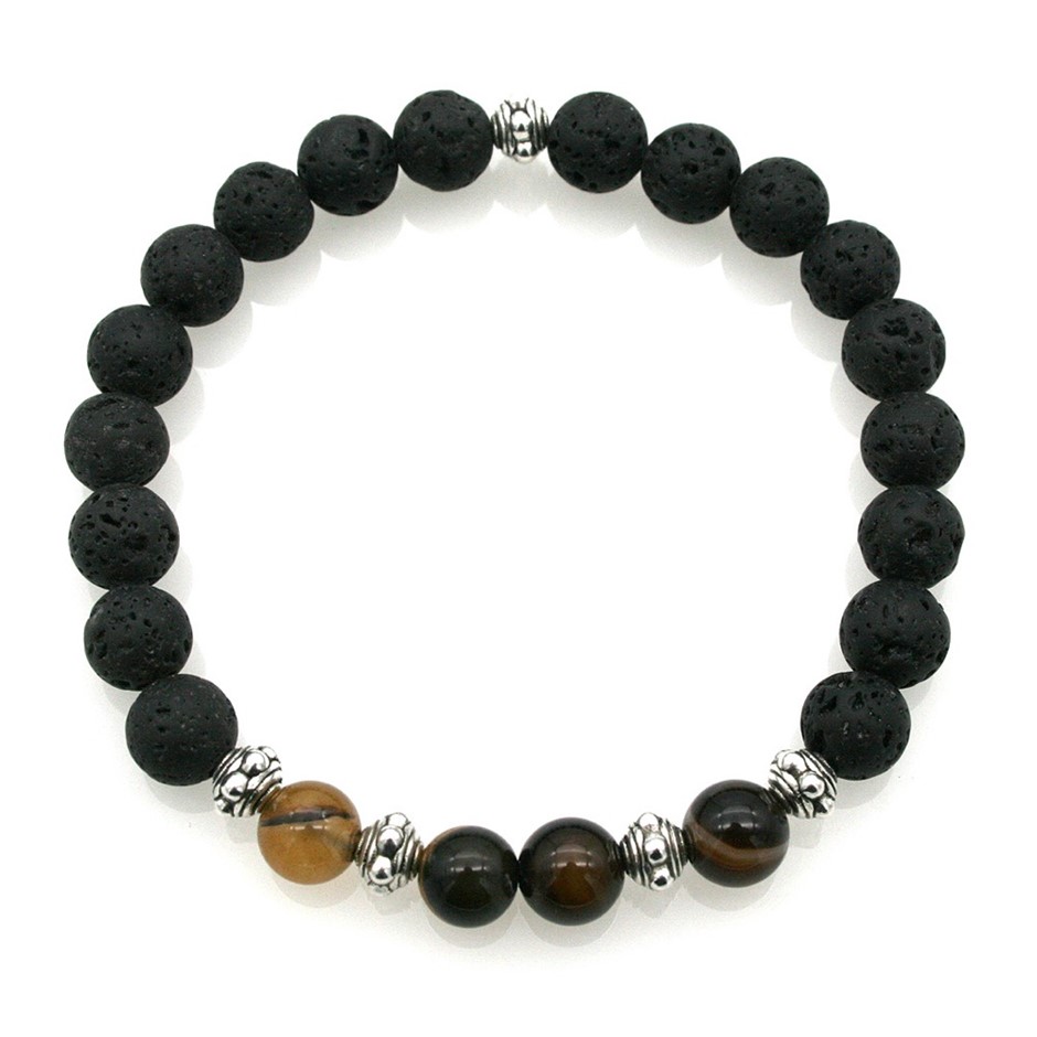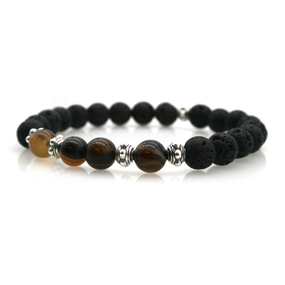 Men`s 8mm Natural Black Lava, Stripey Agate & Silver Beads Stretchy Beaded Stretch Bracelet.