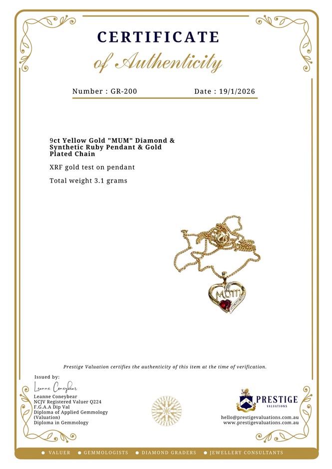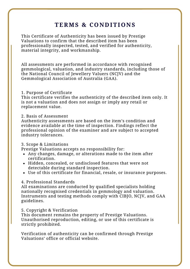 The Certificate of Authenticity means that the actual item for sale has been assessed by a fully qualified specialist jewellery valuer. The specialist jewellery valuer requires knowledge of gemmology, jewellery manufacture, precious metal markets, world gem markets, supply and demand factors both overseas and within Australia, taxation law requirements, general retail practices and the final combination of all the above factors in the principle and procedures of a jewellery valuation. They inspect and assess the jewellery item using a hand lens taking note of several key factors-