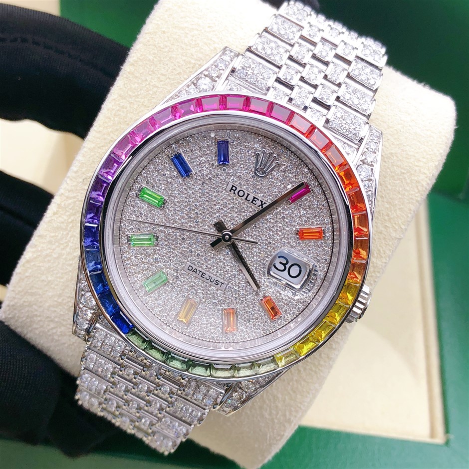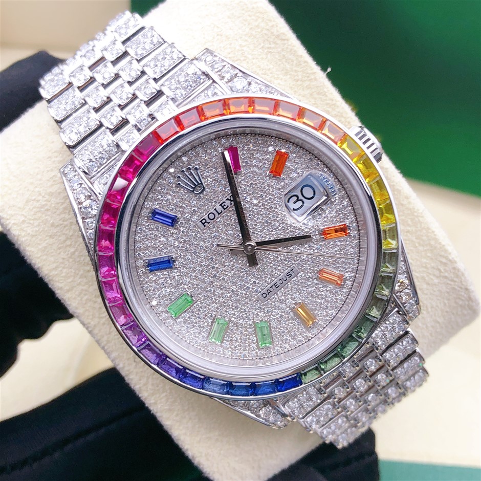 ROLEX DATEJUST 41MM ICED WITH 5 - 8 CARAT SI DIAMOND RAINBOW SAPHIRE BEZEL