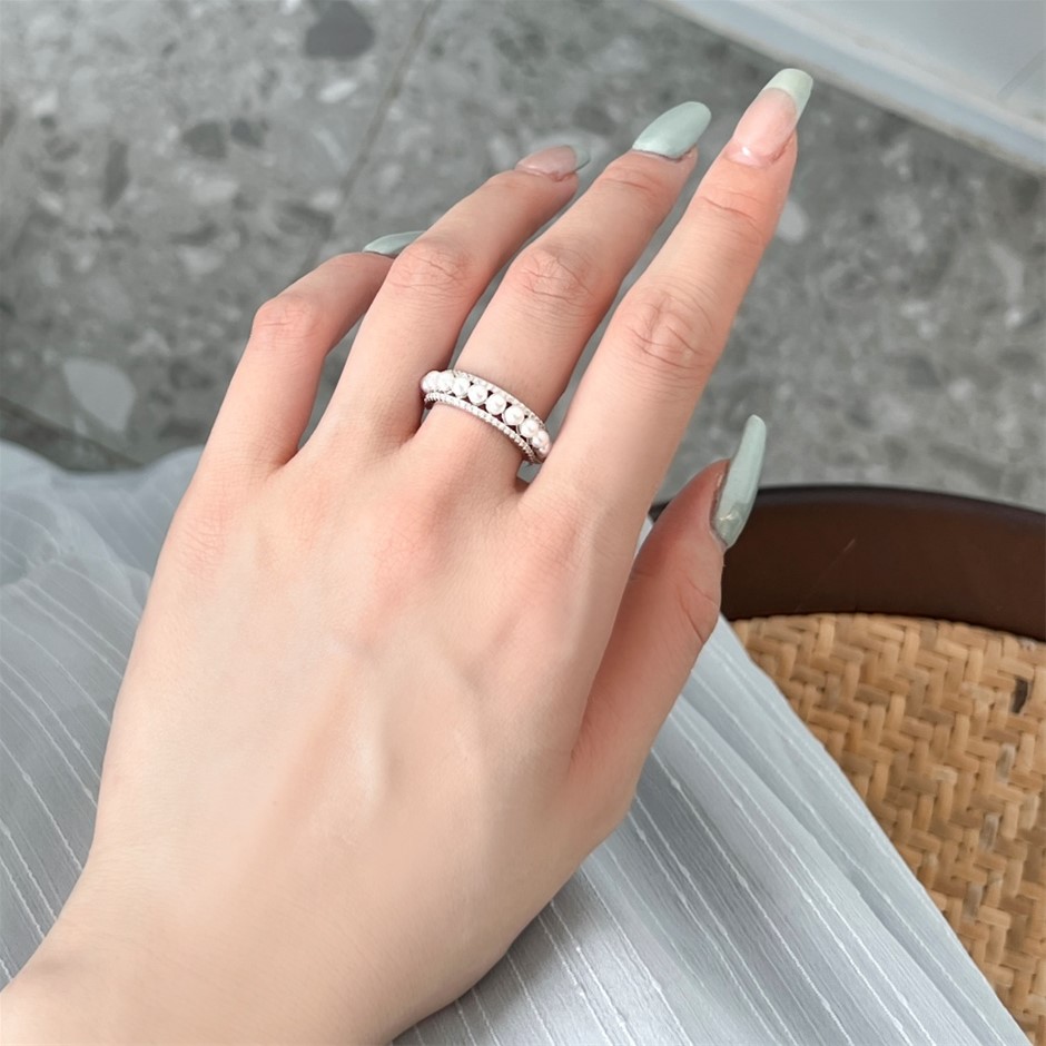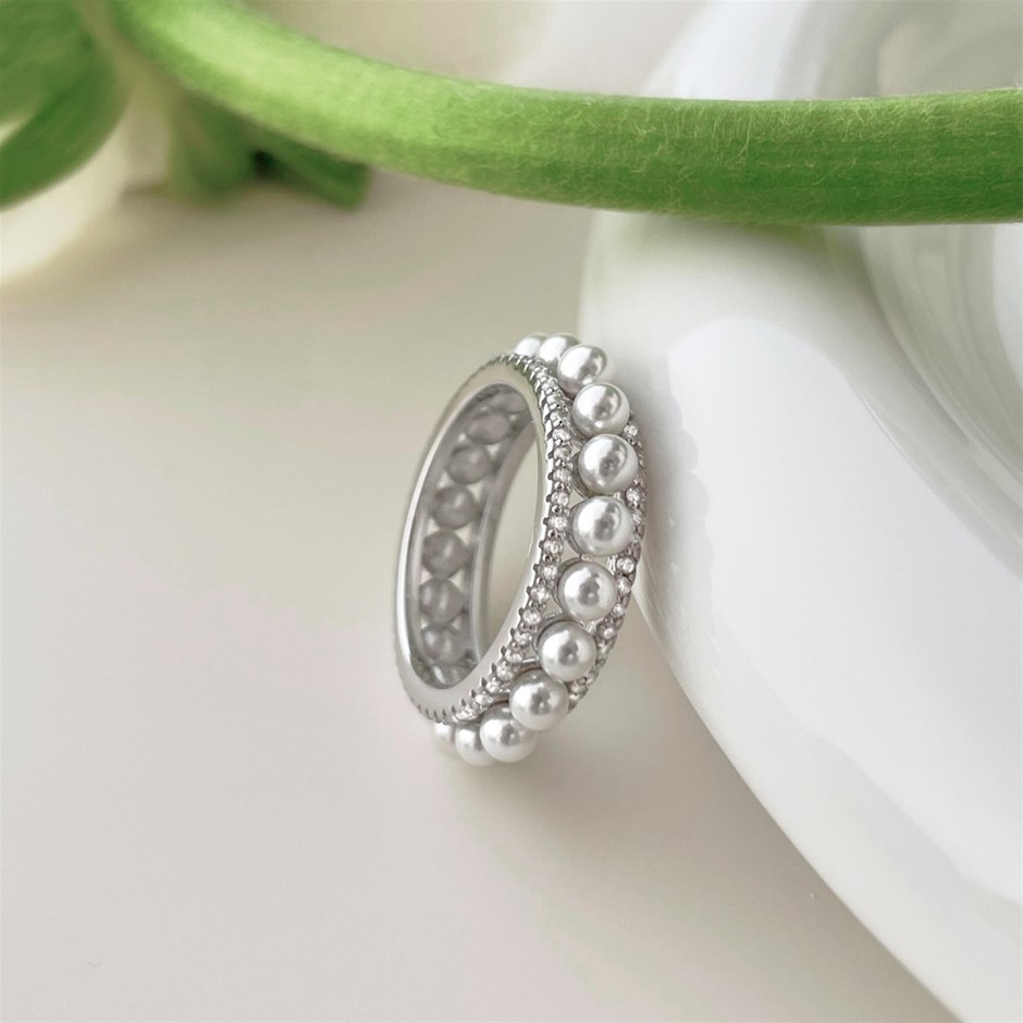 Shell Pearl & Simulated Diamond 925 Sterling Silver Ring - Size 8