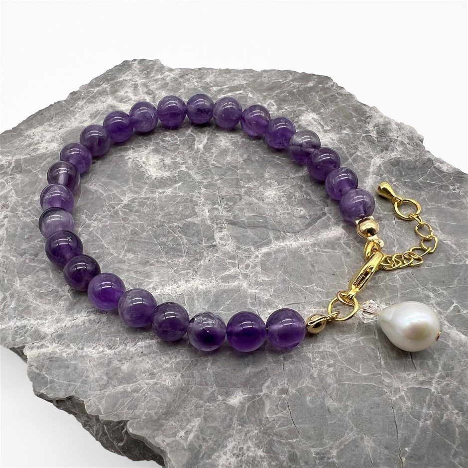 6mm Amethyst & Baroque Pearl Pendant Charm Bracelet