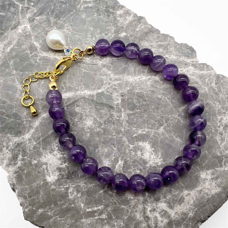 6mm Amethyst & Baroque Pearl Pendant Charm Bracelet Embellished with Swarovski® Crystal.