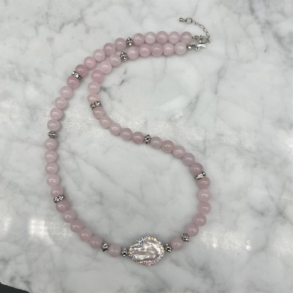 8mm Rose Quartz & Blister Pearl with Rhinestone Beaded Necklace.