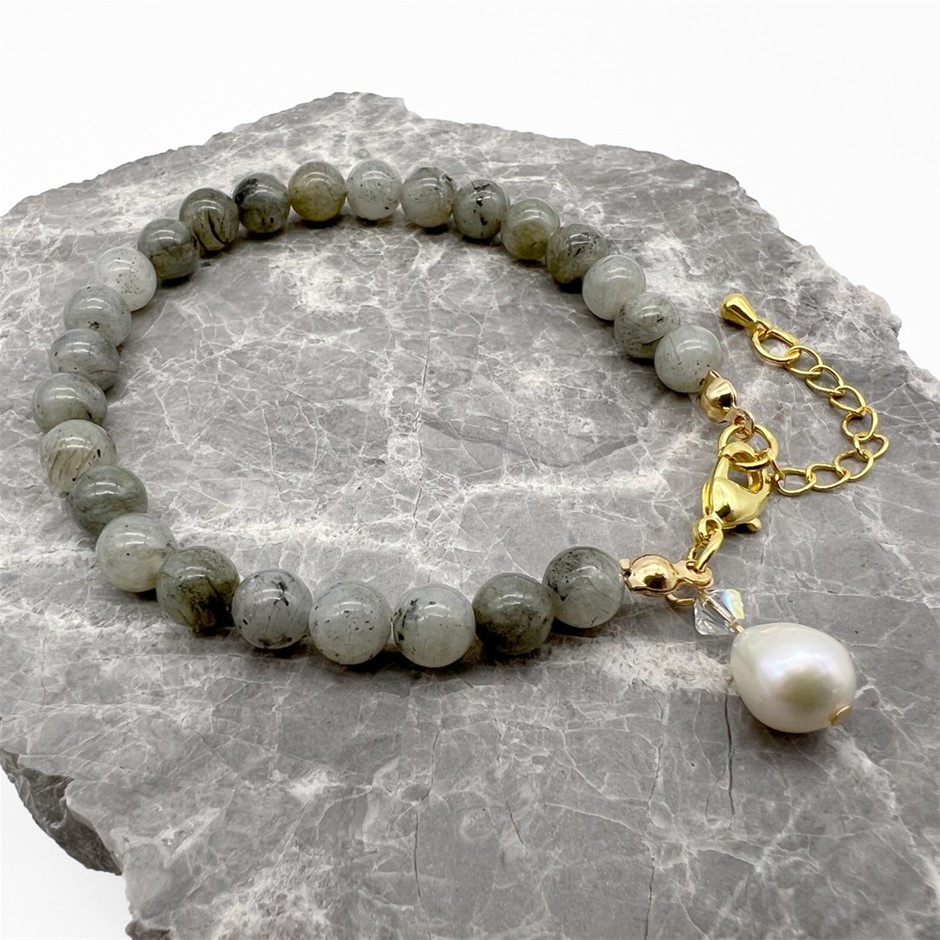 6mm Labradorite & Baroque Pearl Pendant Charm Bracelet Embellished with Swarovski® Crystal.