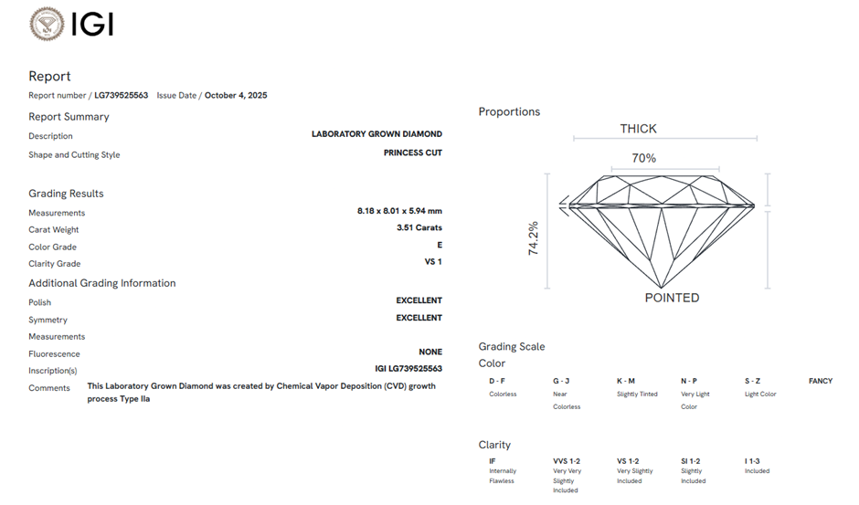 3.51 Carats E/VS1 Lab Grown Diamond - IGI Certified