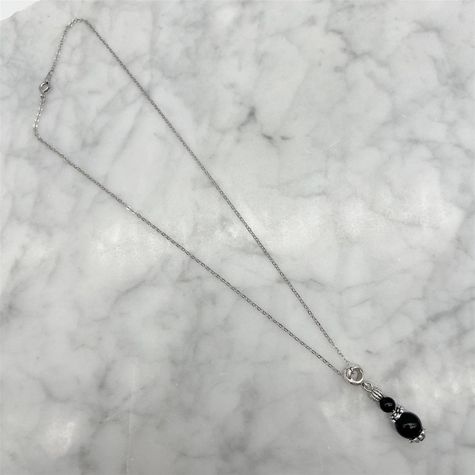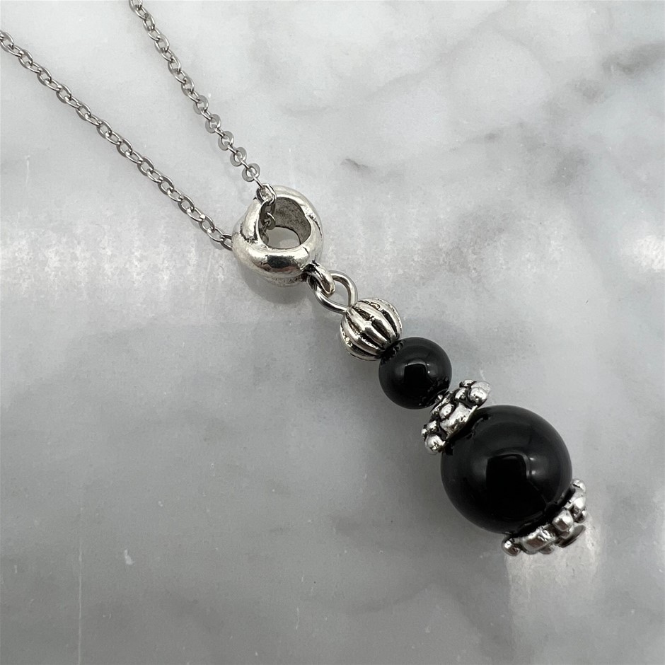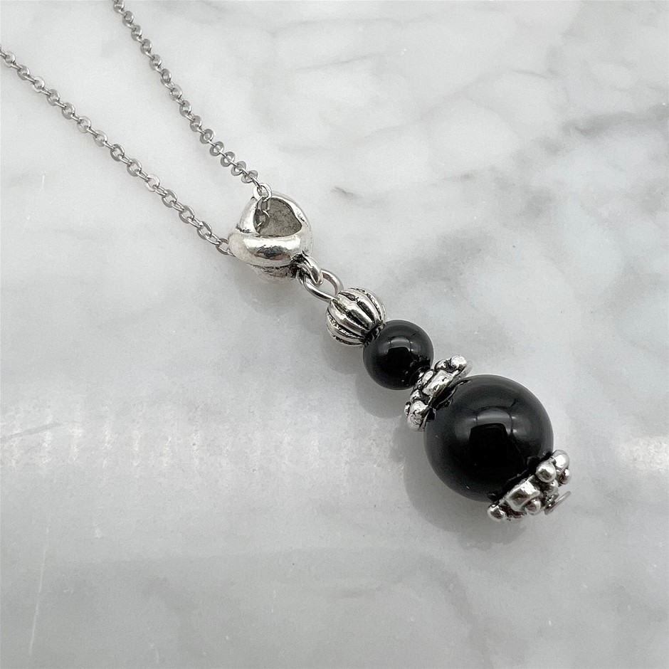 Genuine Black Agate Antique Style Silver & Platinum Plated Pendant Necklace