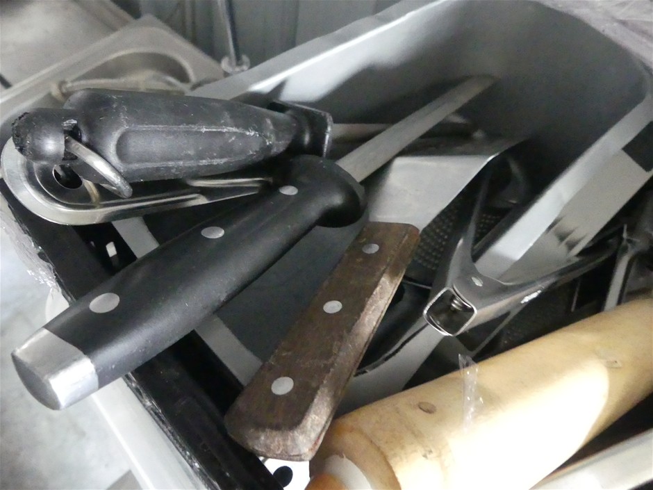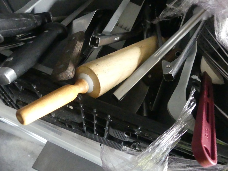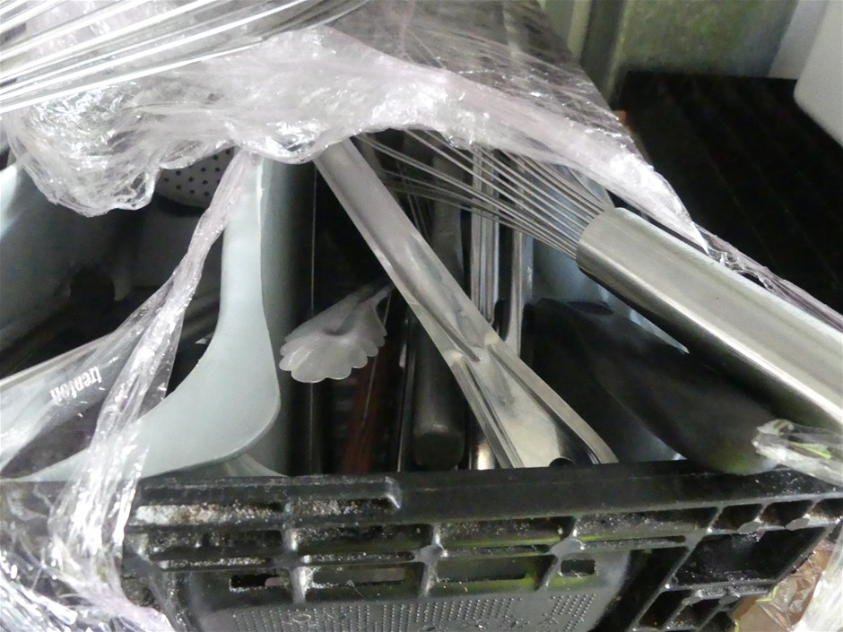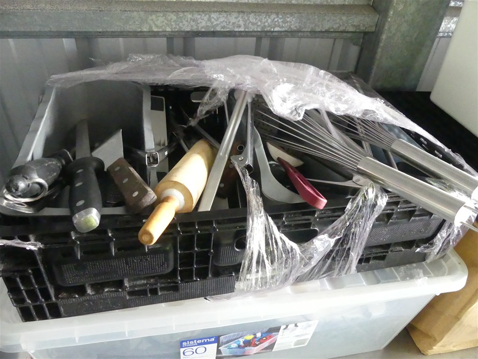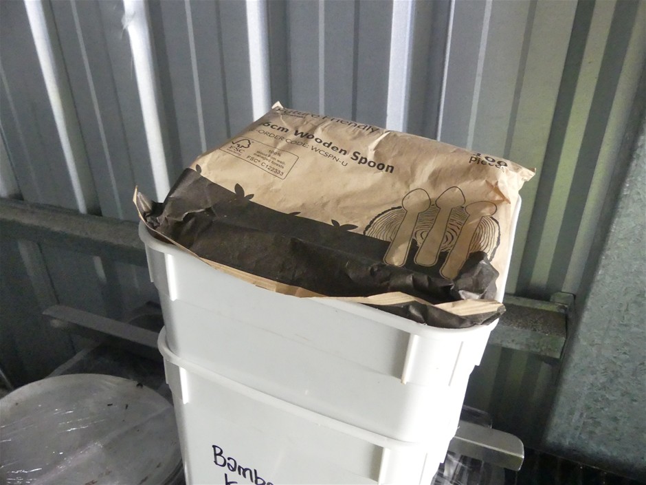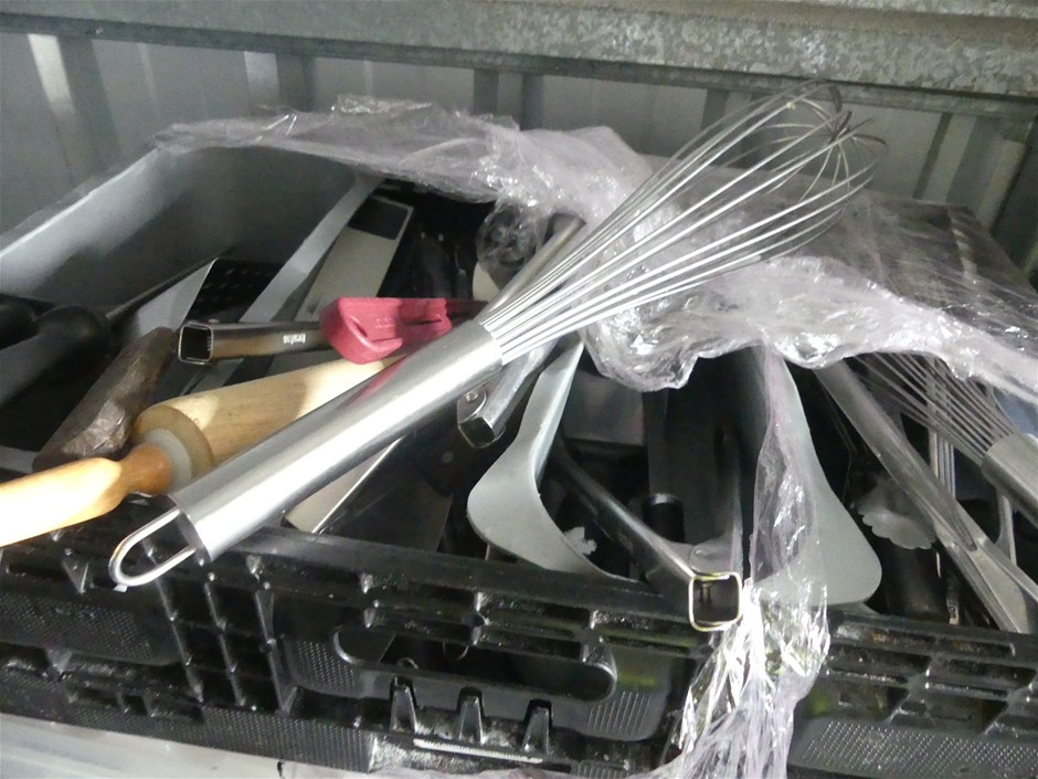 Contents includeGranit umbrella bases,assorted commercial kitchen utensils,Disposable spoons