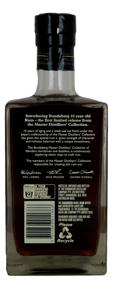 Bundaberg Rum Master Distillers Collection Aged 10 Years is the first limited release from the Master Distiller collection. Aged 10 years in small oak vats, this is a special rum with a unique smoothness and balance. Phil Larsen, Rick Prosser and Damien O`Neall are the three Master Distillers responsible for this limited edition 10 year old blended rum.The first MDC bottle in the series was actually made in France and the bottle condition and writing on the bottle has held up much better than the later Chinese made bottles.