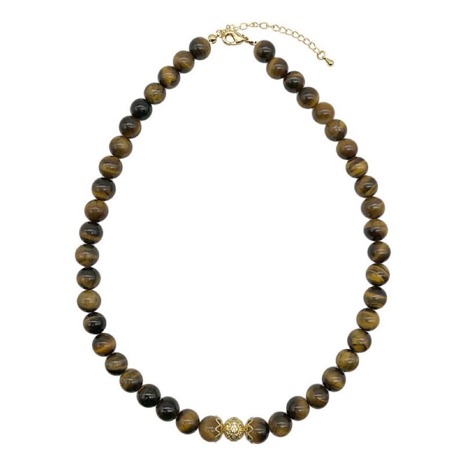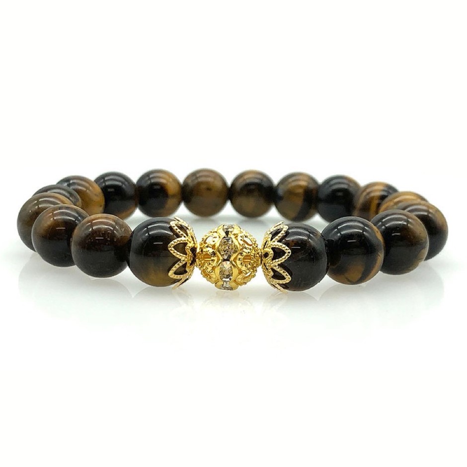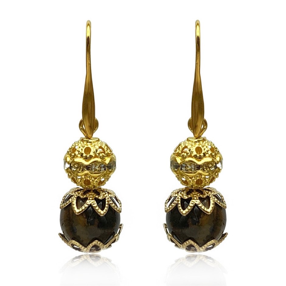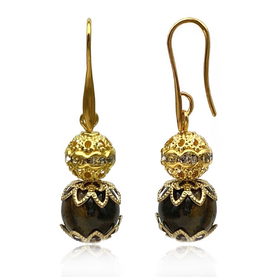 10mm Natural Tiger Eye Persian Love Gold Plated Rhinestone Necklace, Bracelet & Earring Set.