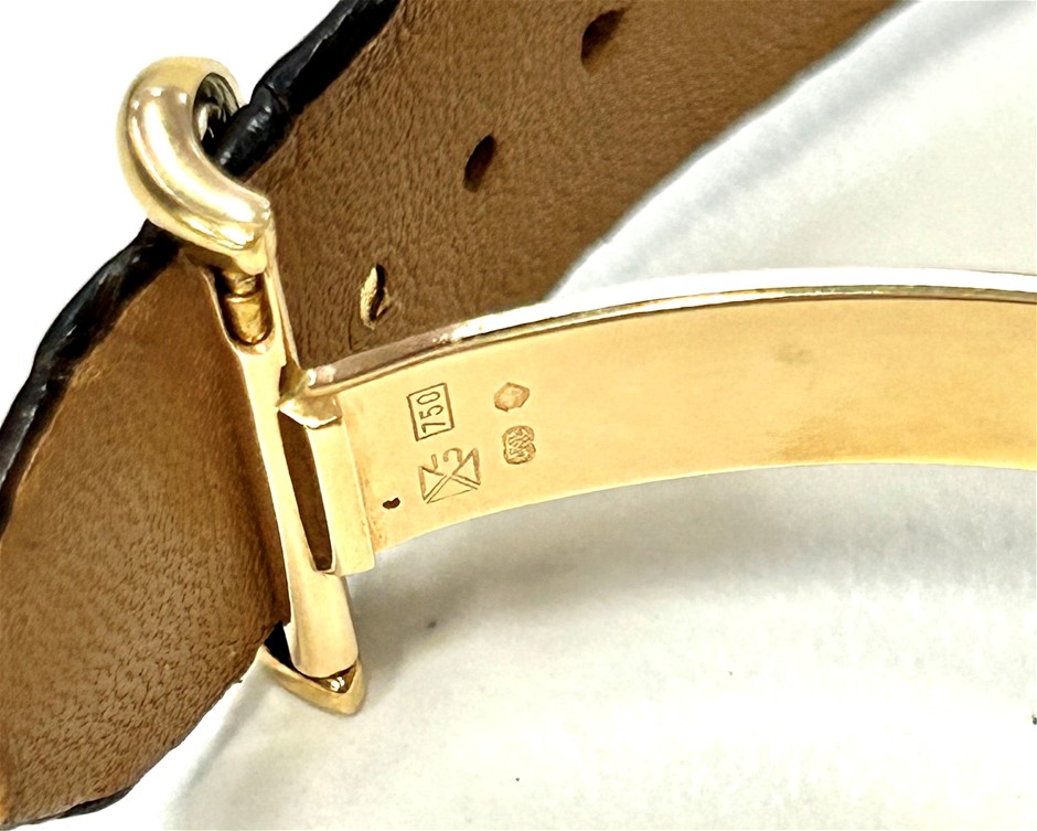 model Prive limited edition number 60, cream guilloche dial with gold pointed hour markers, 18ct gold bezel/case measures 34mm, skeleton back, sapphire crystal, water resistant, hallmark 750, brown alligator strap with adjustable 18ct gold fold over clasp, original box & papers. This item has been professionally verified as a genuine product and comes with accompanying 3rd party Certificate of Authenticity (306638-36)