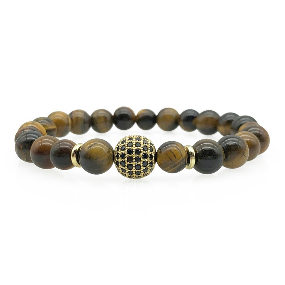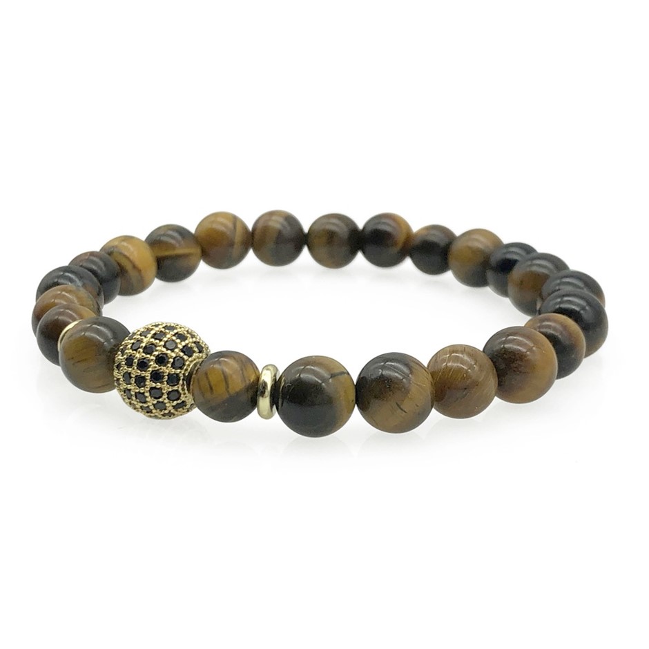 Men's 8mm Tiger Eye & Golden Rhinestone Beaded Gemstone Bracelet