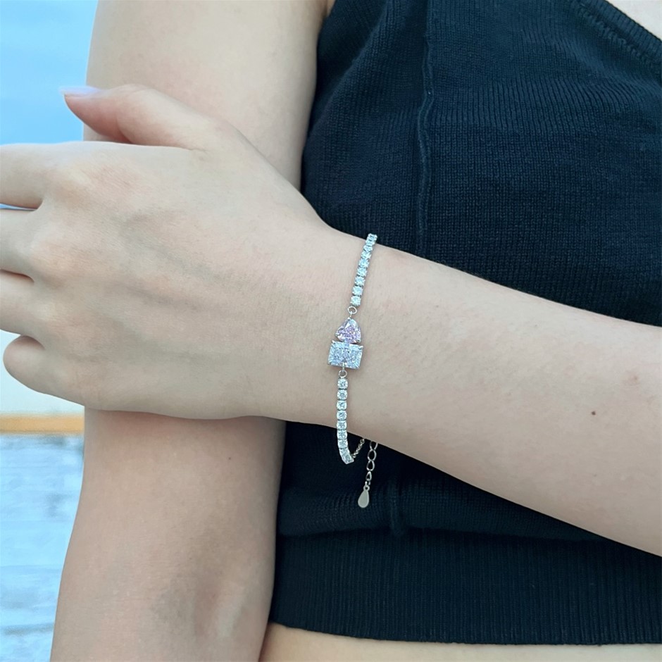 Rectangle & Heart 925 Sterling Silver Link Bracelet with Simulated Diamonds