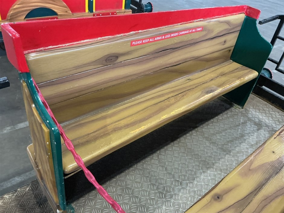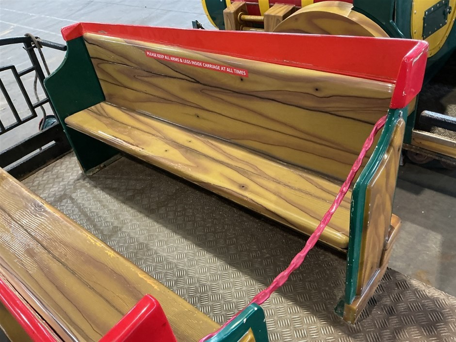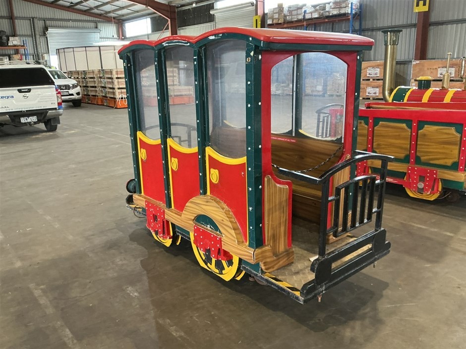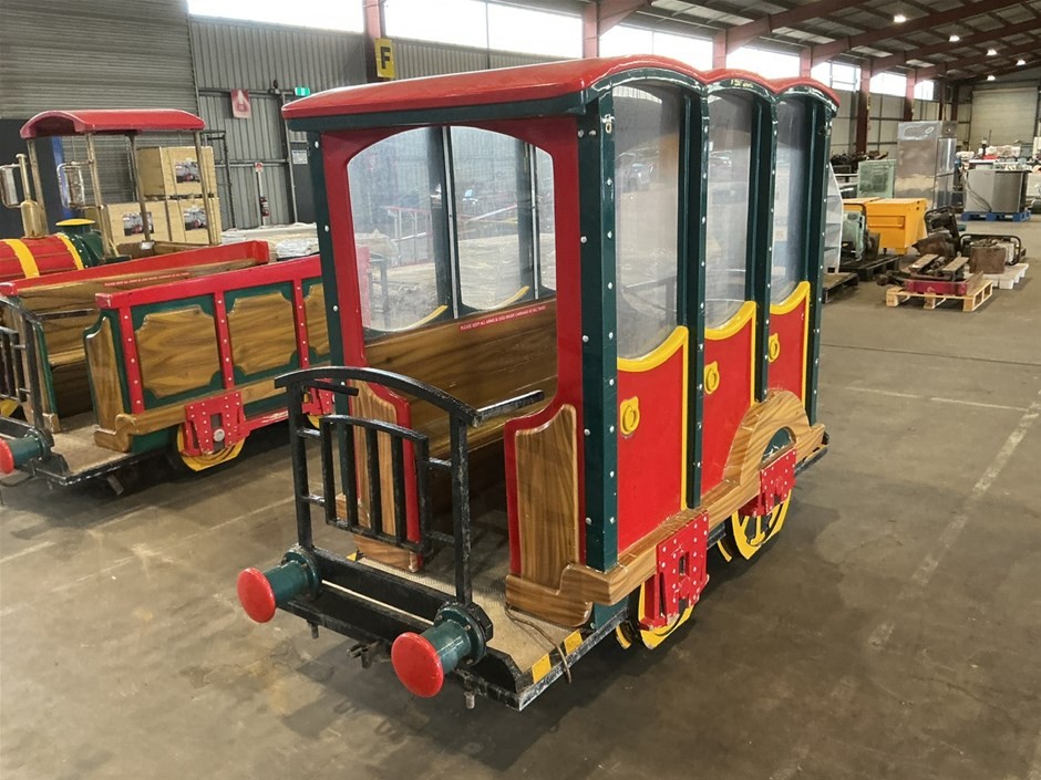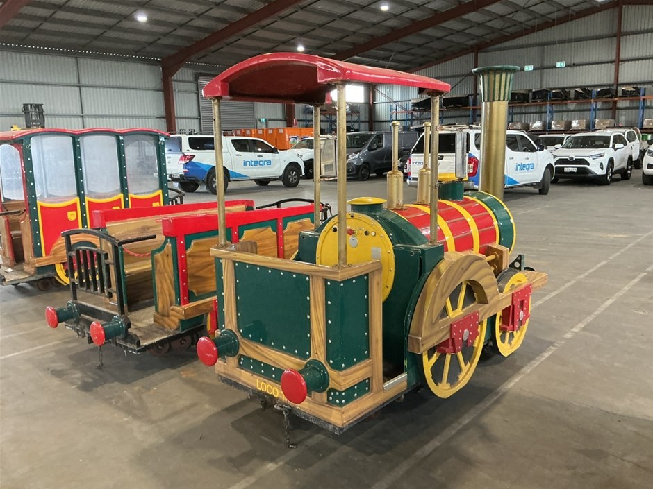 • Childrens Train Ride, 3 sections, Theme Park Style, consists of train engine and 2 cabooses/carriages with bench seating, fibreglass and Metal construction, emergency stop button, no key, couplings to join together,