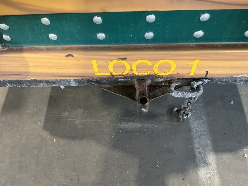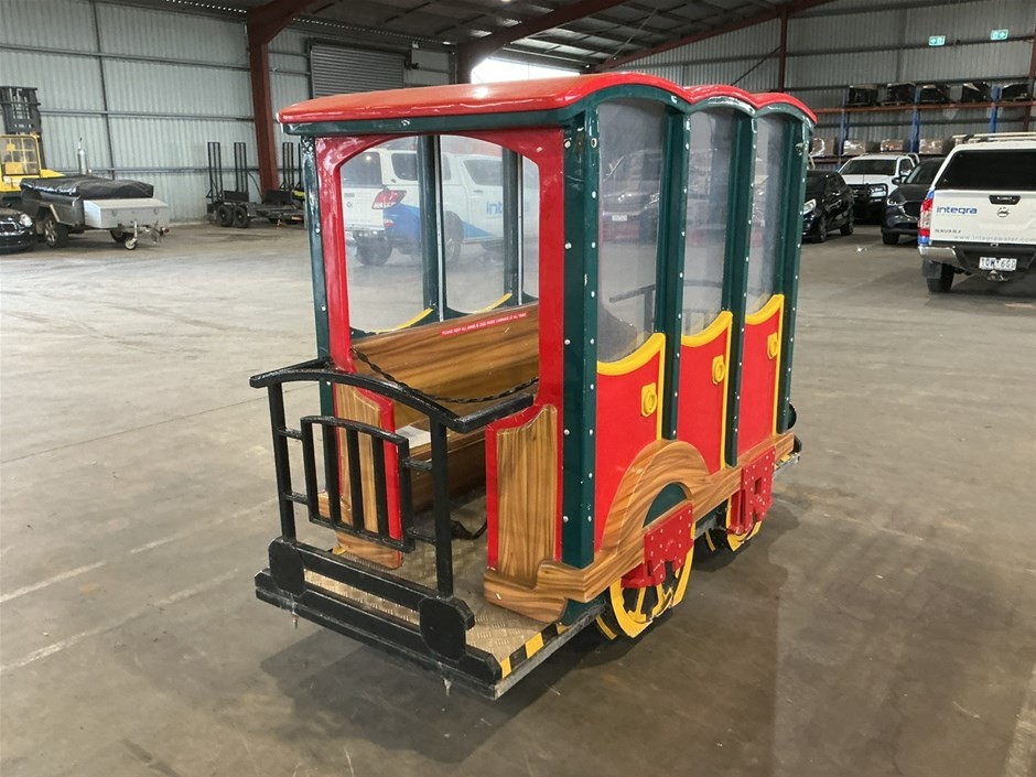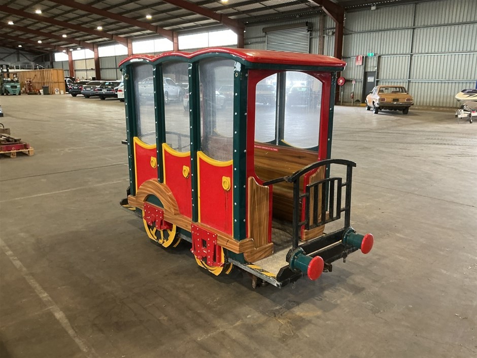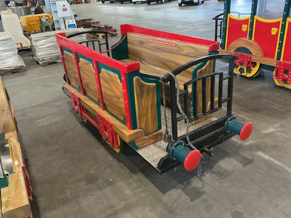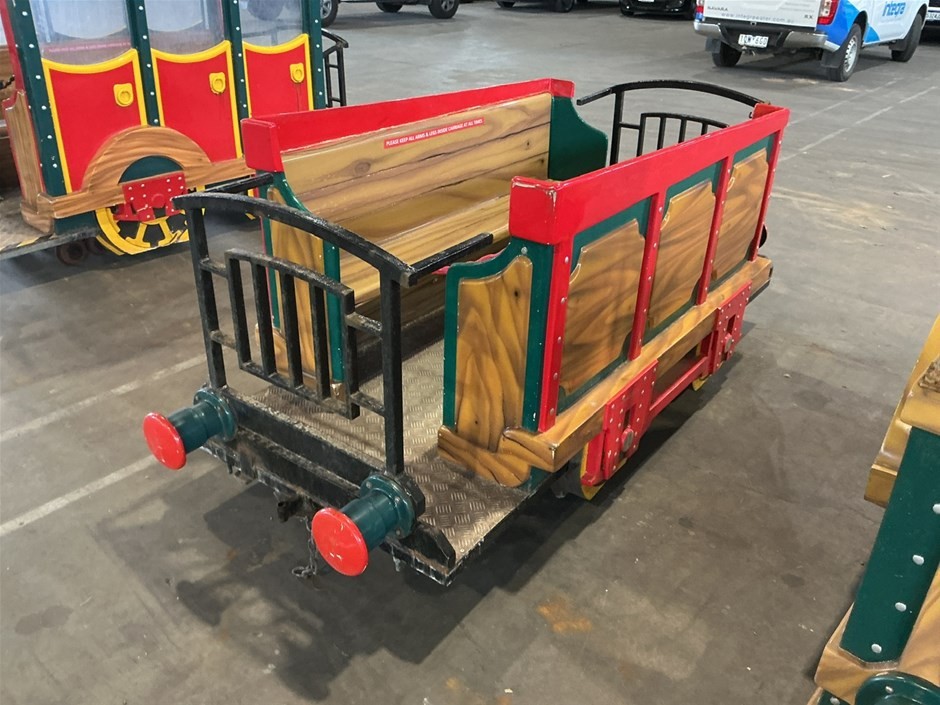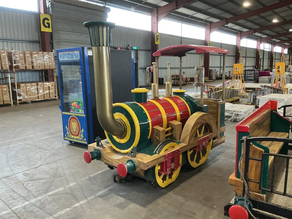 • Childrens Train Ride, 3 sections, Theme Park Style, consists of train engine and 2 cabooses/carriages with bench seating, fibreglass and Metal construction, emergency stop button, no key, couplings to join together,