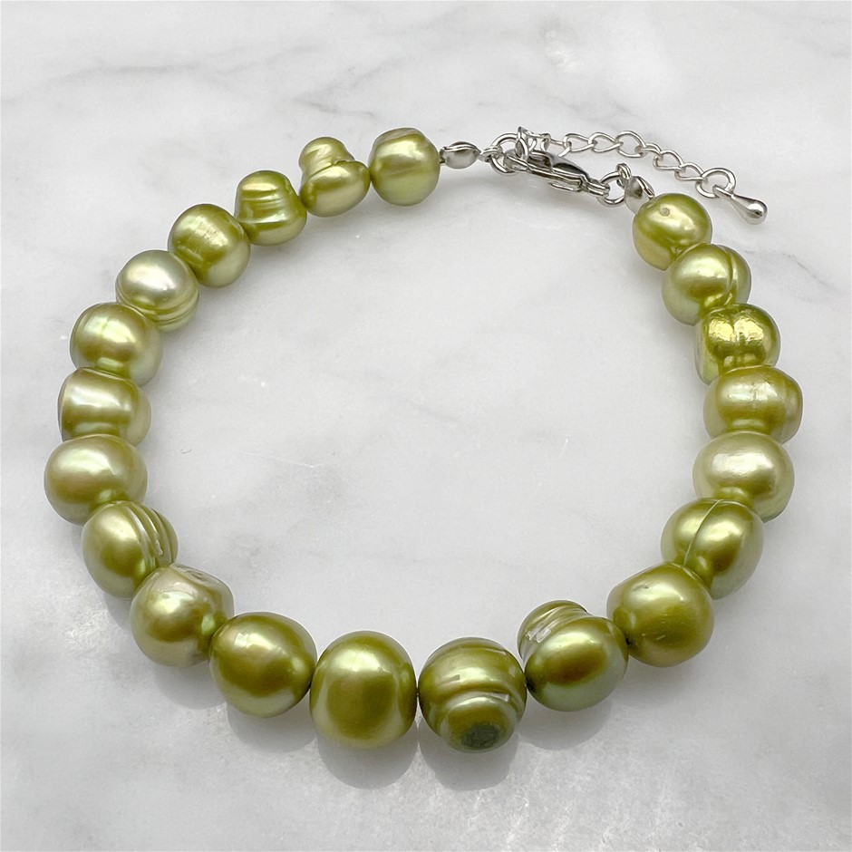 7-8mm Green Potato Shape Pearl with Platinum Plated Bracelet