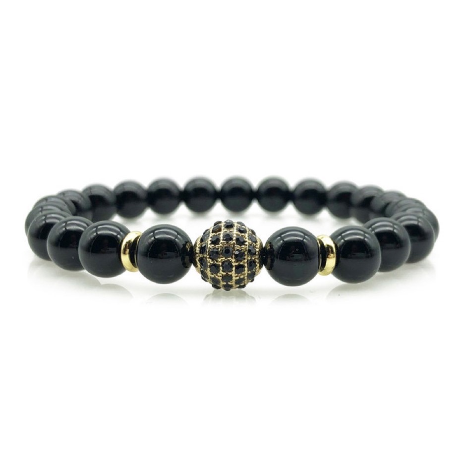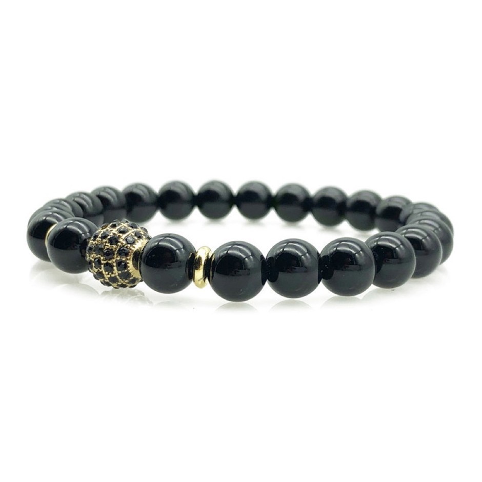 Men`s 8mm Black Agate & Golden Rhinestone Beaded Gemstone Bracelet.