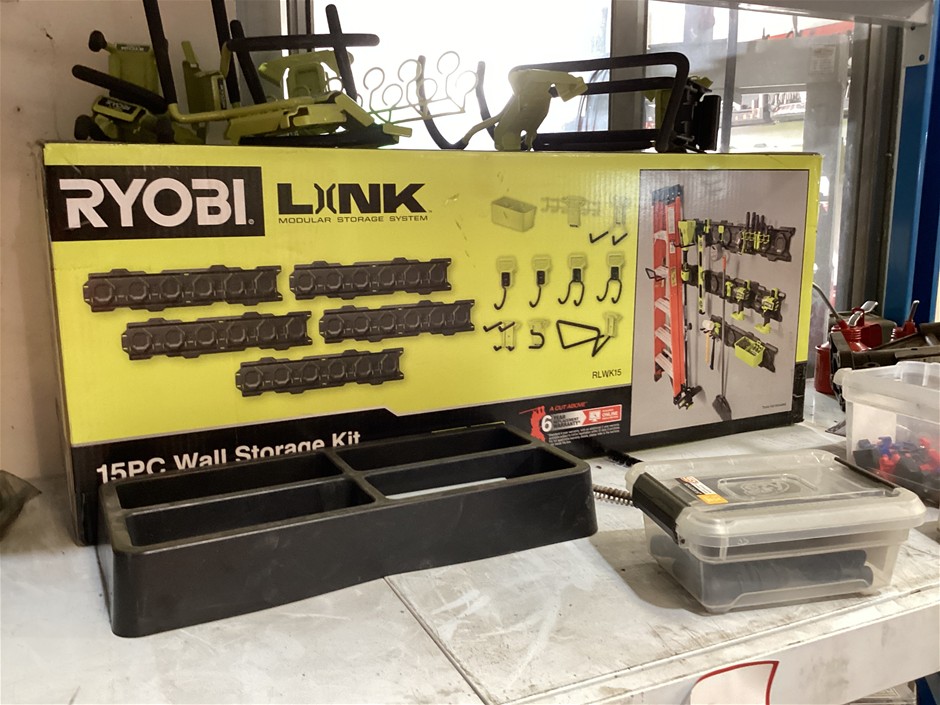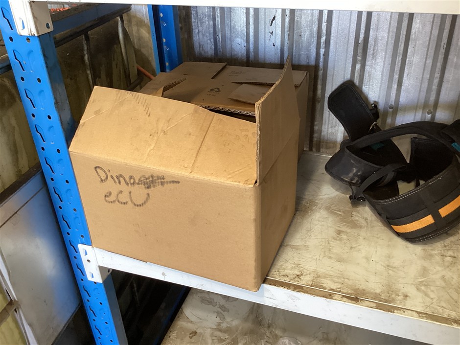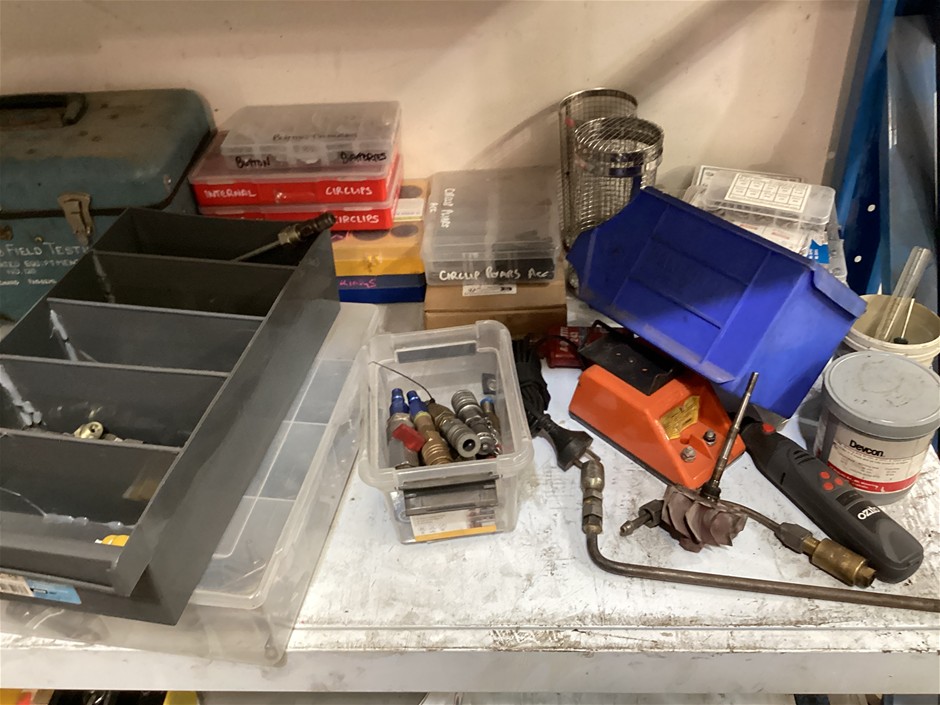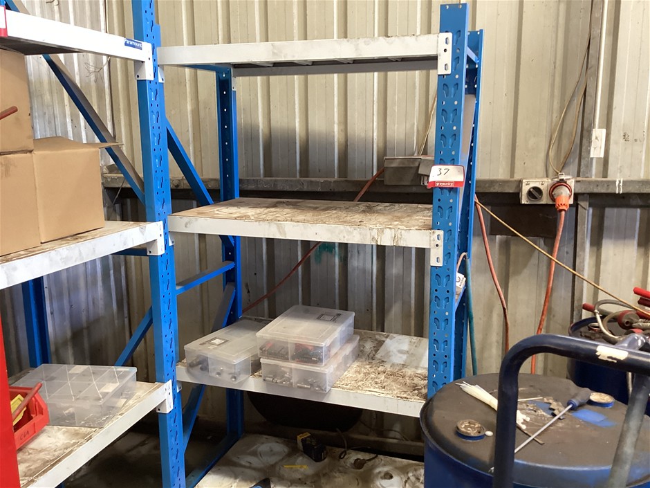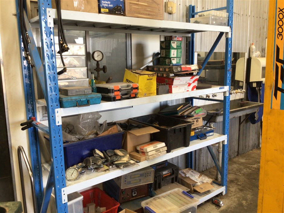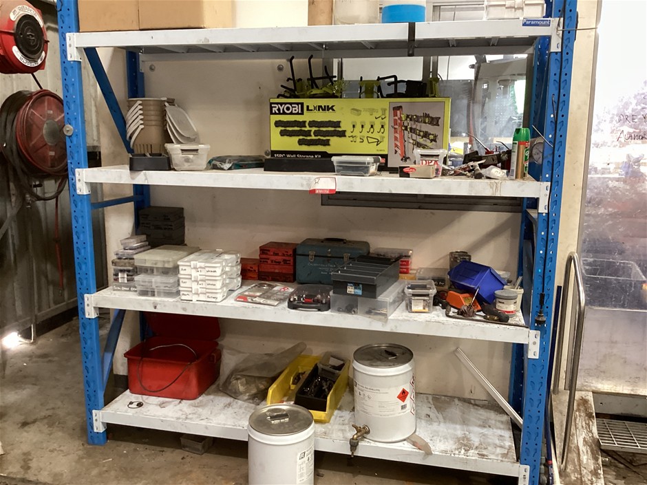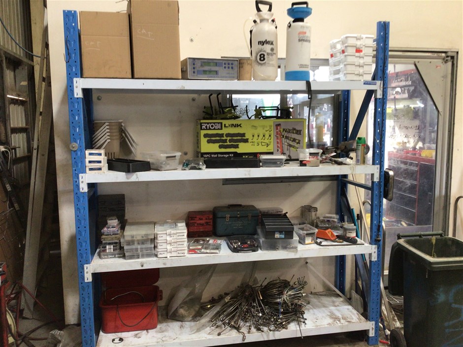 • 4 tier shelves, capacity unknown, includes a smaller shelving unit, contents include plastic storage boxes with various hardware, kitchen organics plastic sink bins, ozito engraver, various car components in boxes, etc