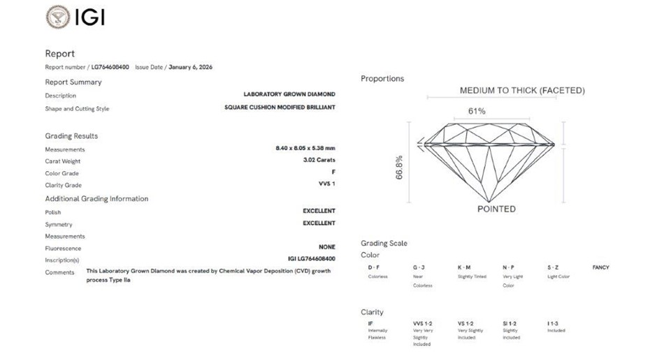3.02 Carats F/VVS1 Lab Grown Diamond - IGI Certified