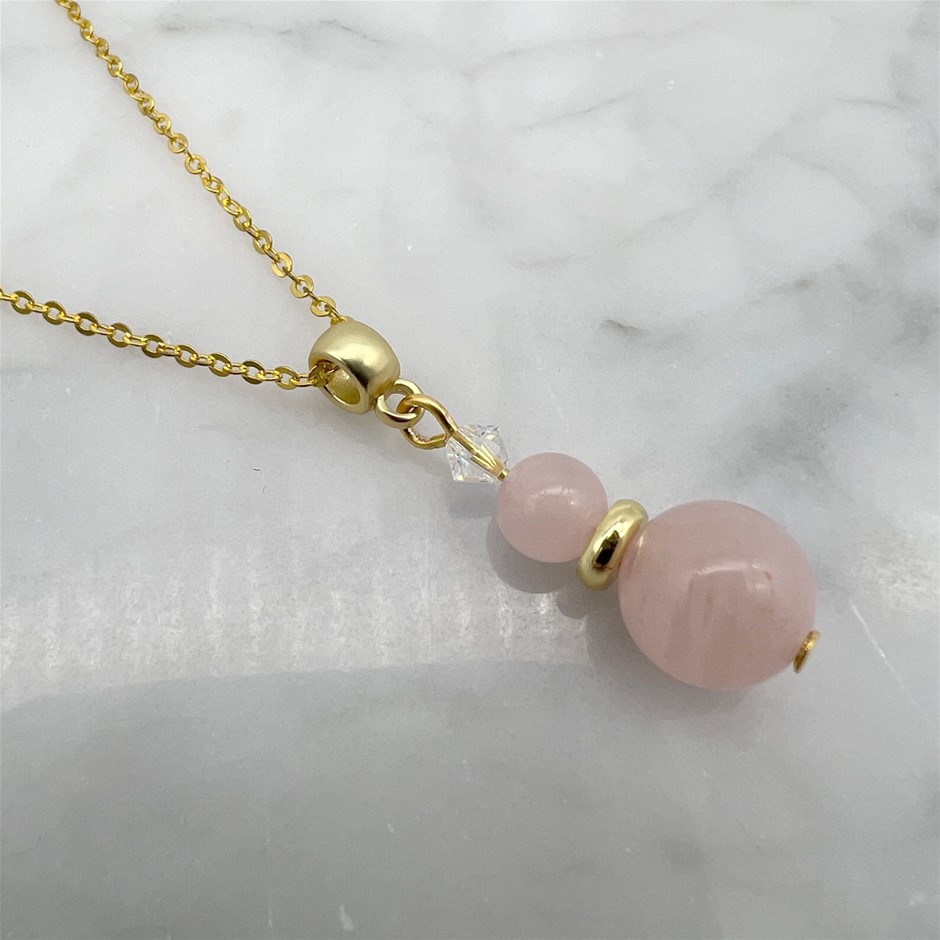 Genuine Rose Quartz & Swarovski® Austrian Crystal Gold Plated Pendant Necklace