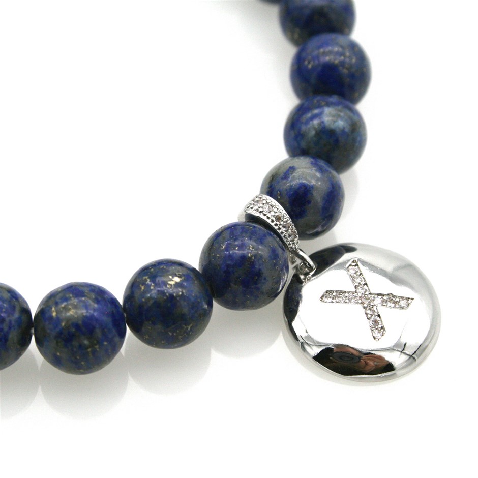 Round Lapis Lazuli & Letter Platinum 'X' Plated with CZ Bracelet