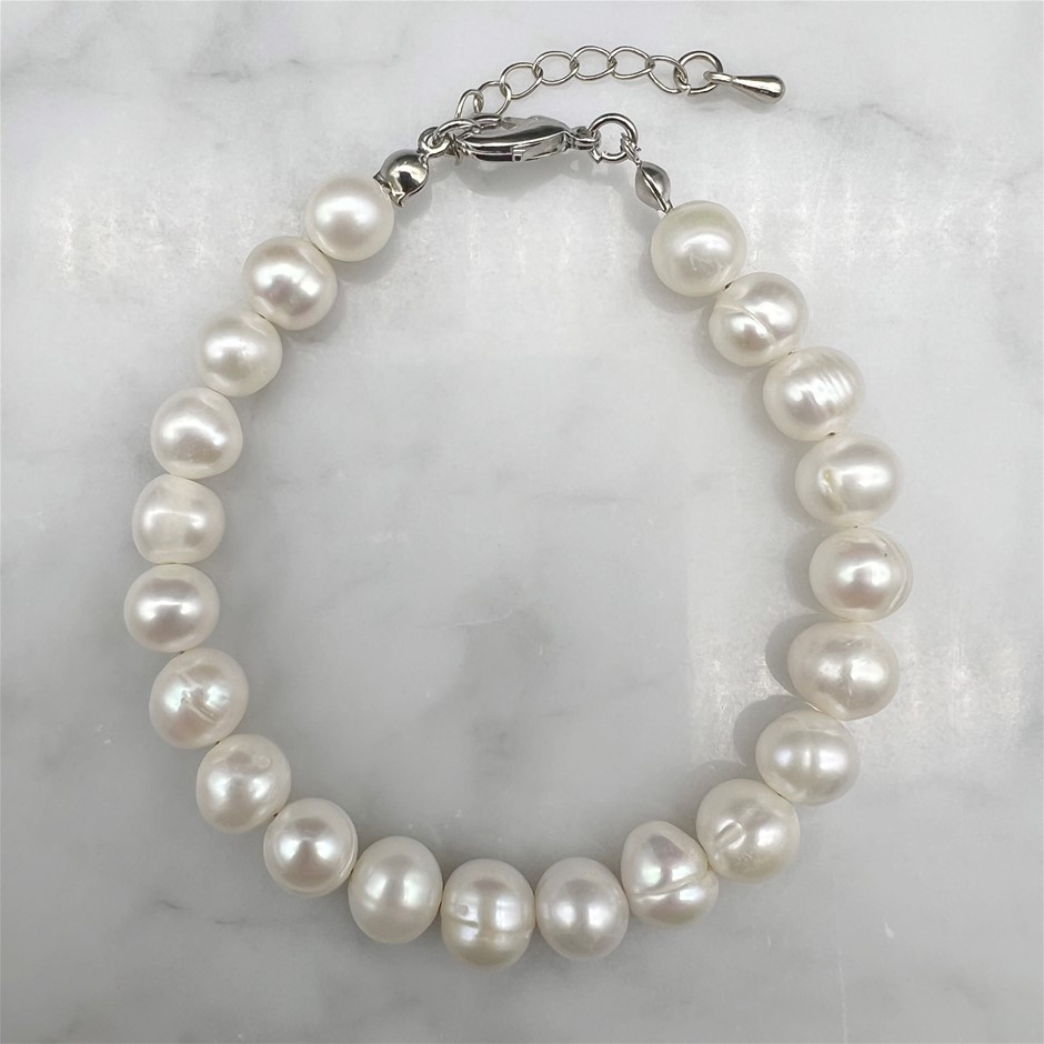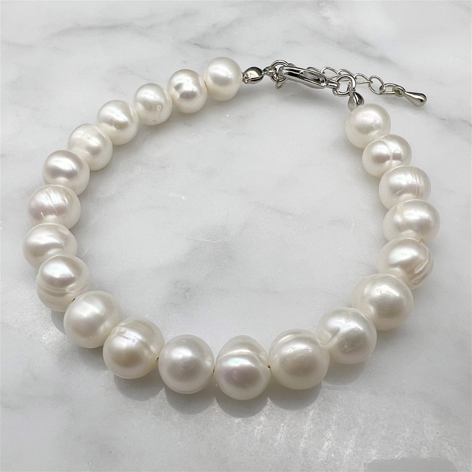 Natural 8-9mm White Potato Shape Freshwater Pearl with Platinum Plated Bracelet