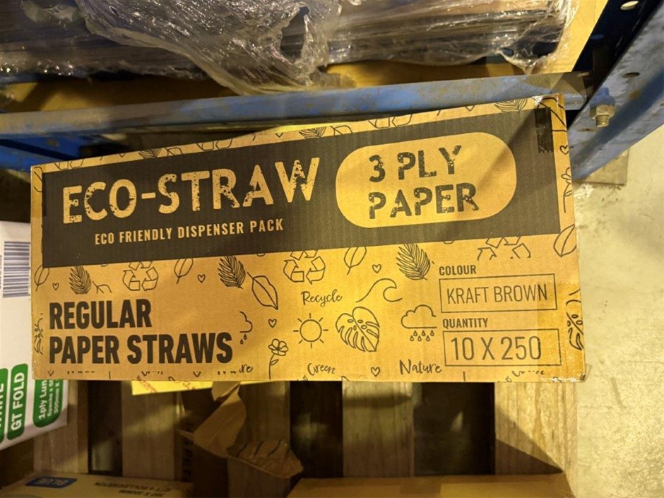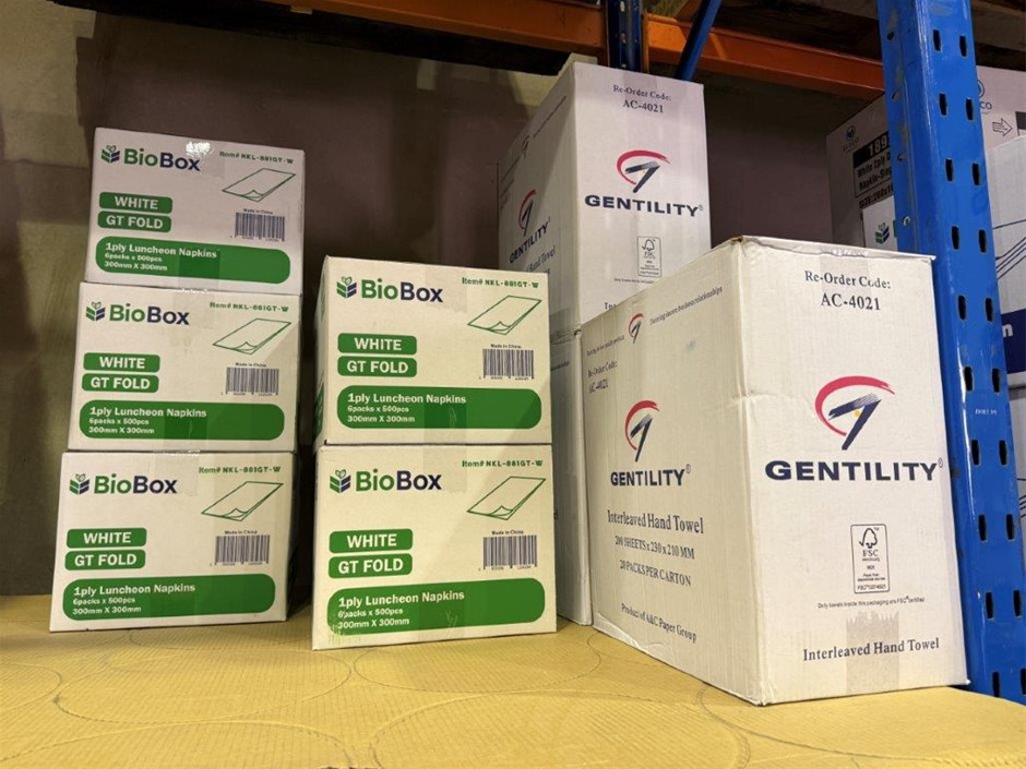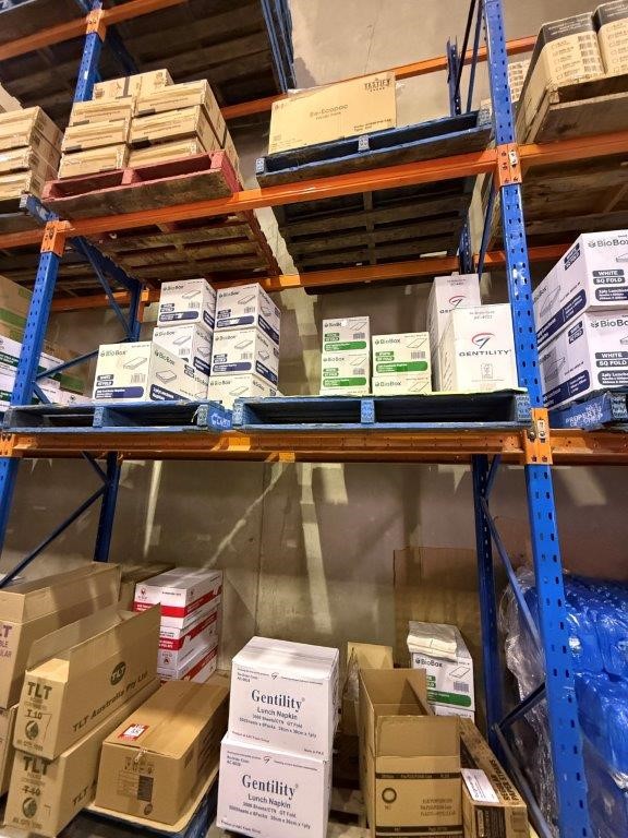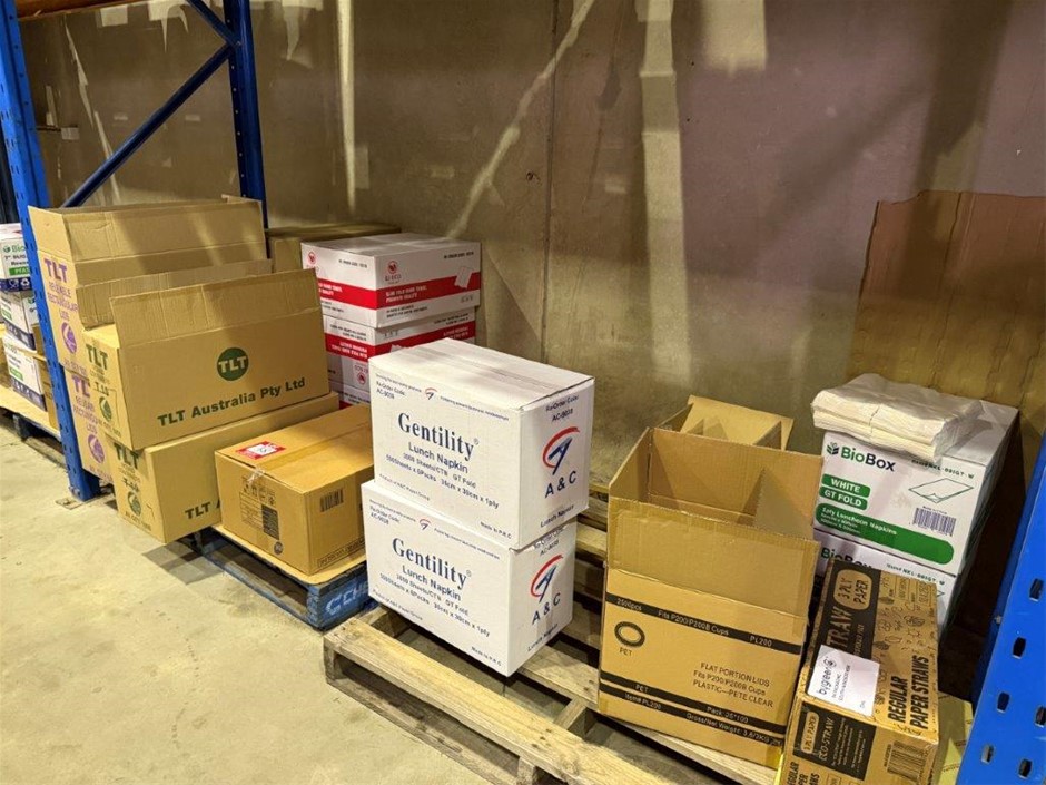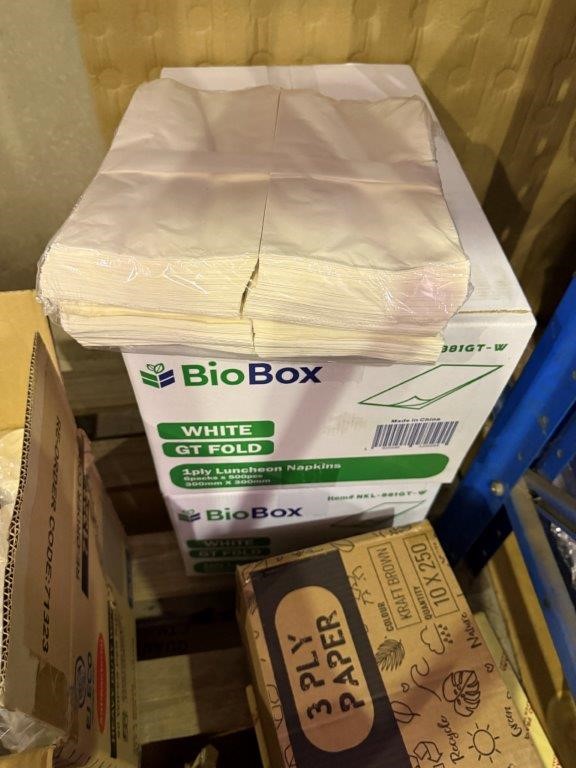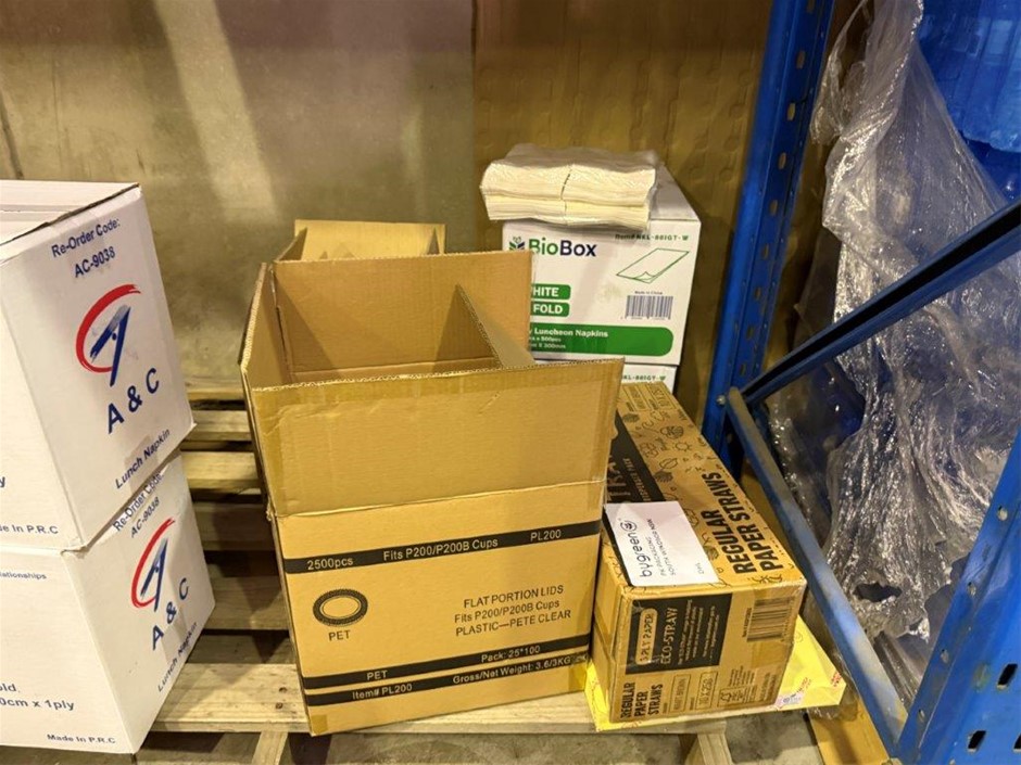 • Bay of mixed lot of hospitality supplies including napkins, hand towels, straws, plastic containers, lids and assorted paper goods. Brands include BioBox, Gentility, EJ Eco, TLT, Pinnacle and Eco-Straw.