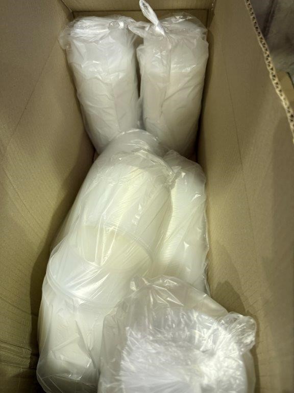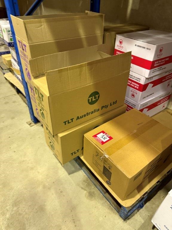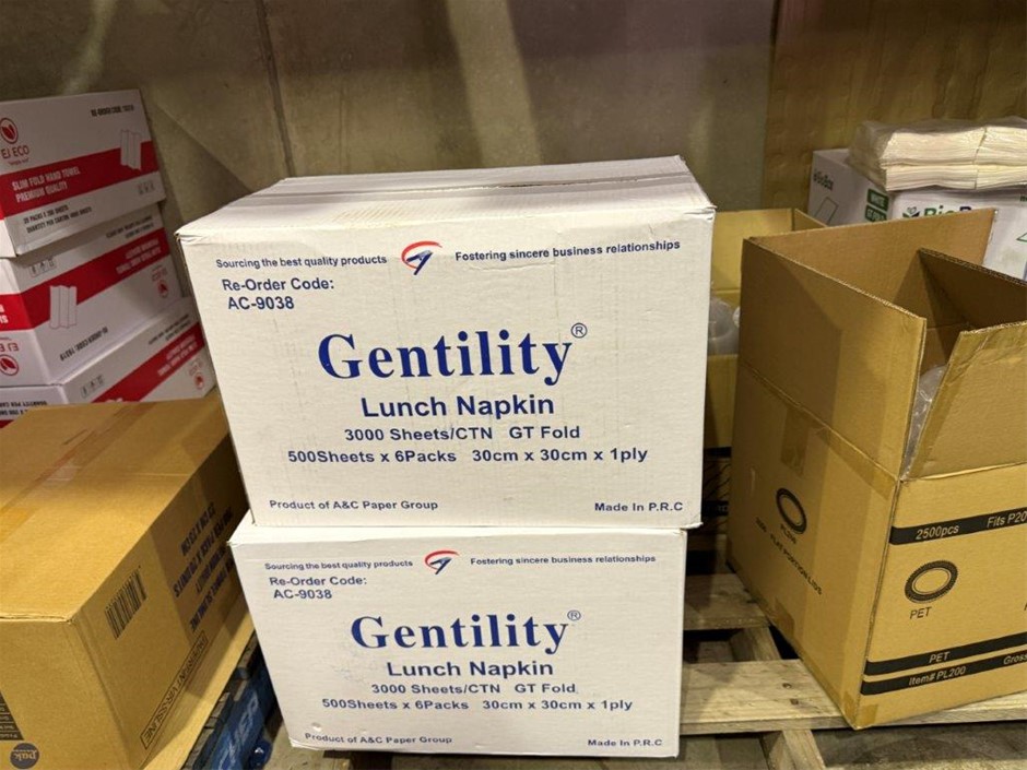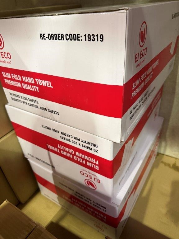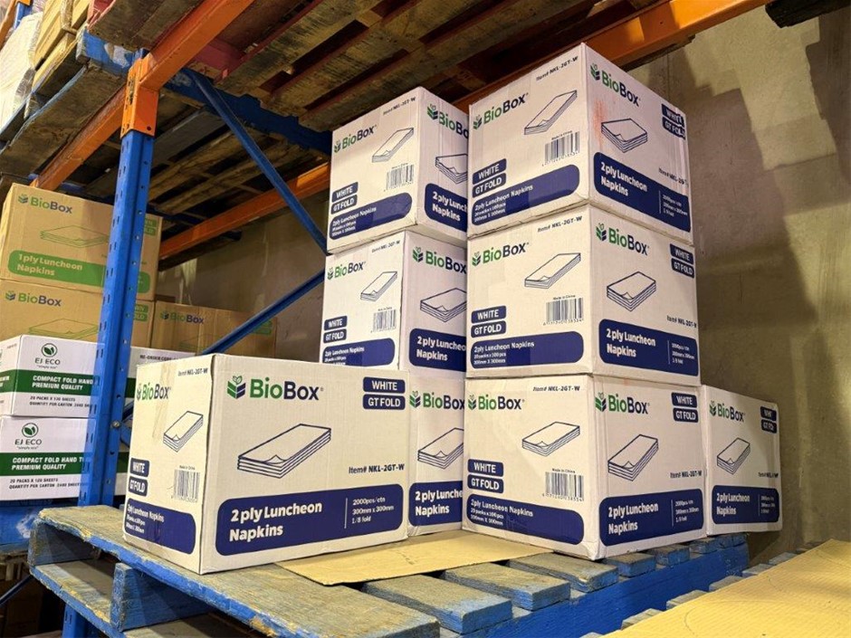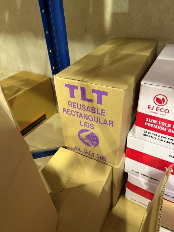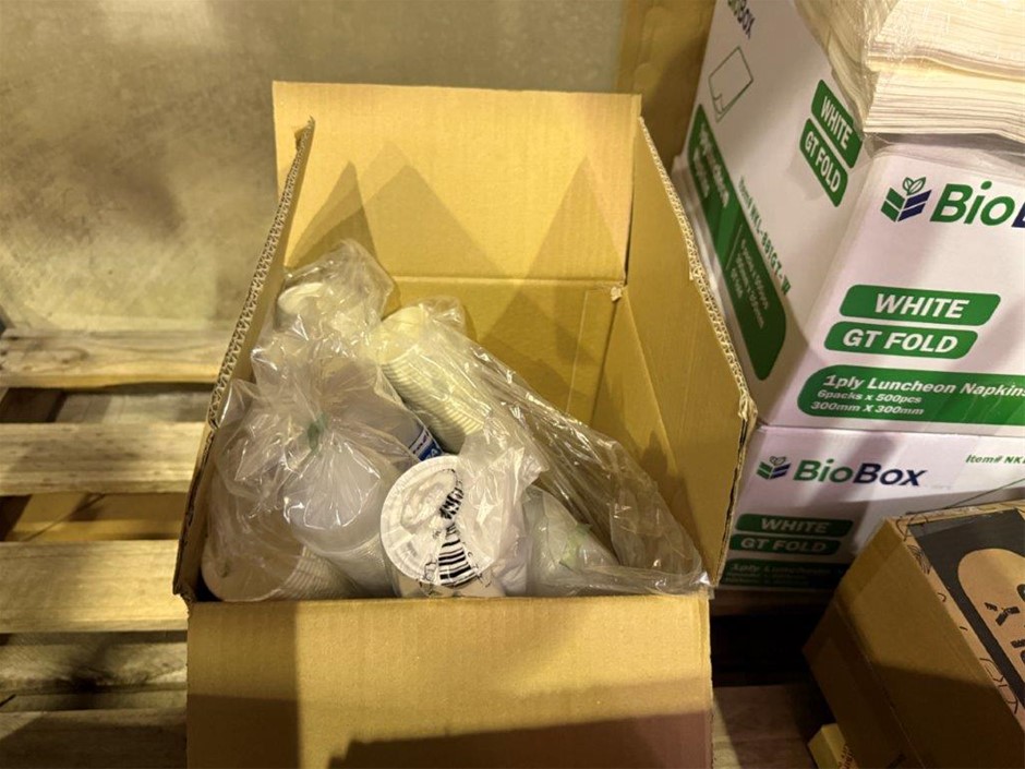 • Bay of mixed lot of hospitality supplies including napkins, hand towels, straws, plastic containers, lids and assorted paper goods. Brands include BioBox, Gentility, EJ Eco, TLT, Pinnacle and Eco-Straw.