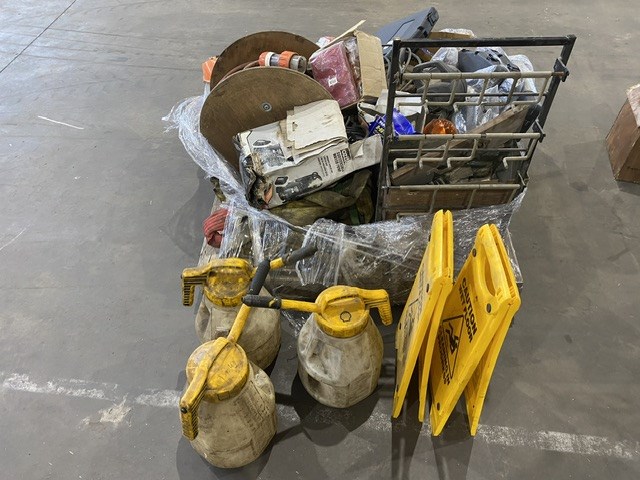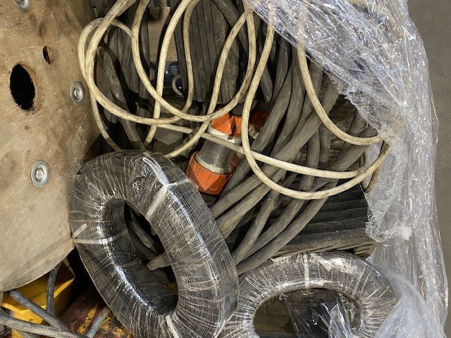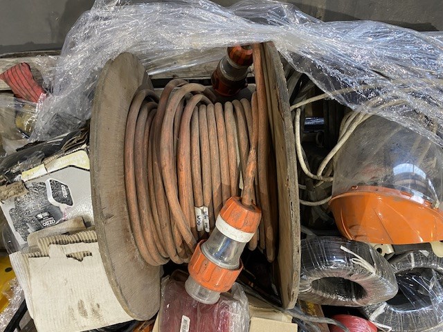 • Consisting of a length of 3 phase 32amp power cabling with power plugs, Rolls of unused tin coated copper cabling, manual holders, fuel refuelling bottles and sundry items, 1 pallet