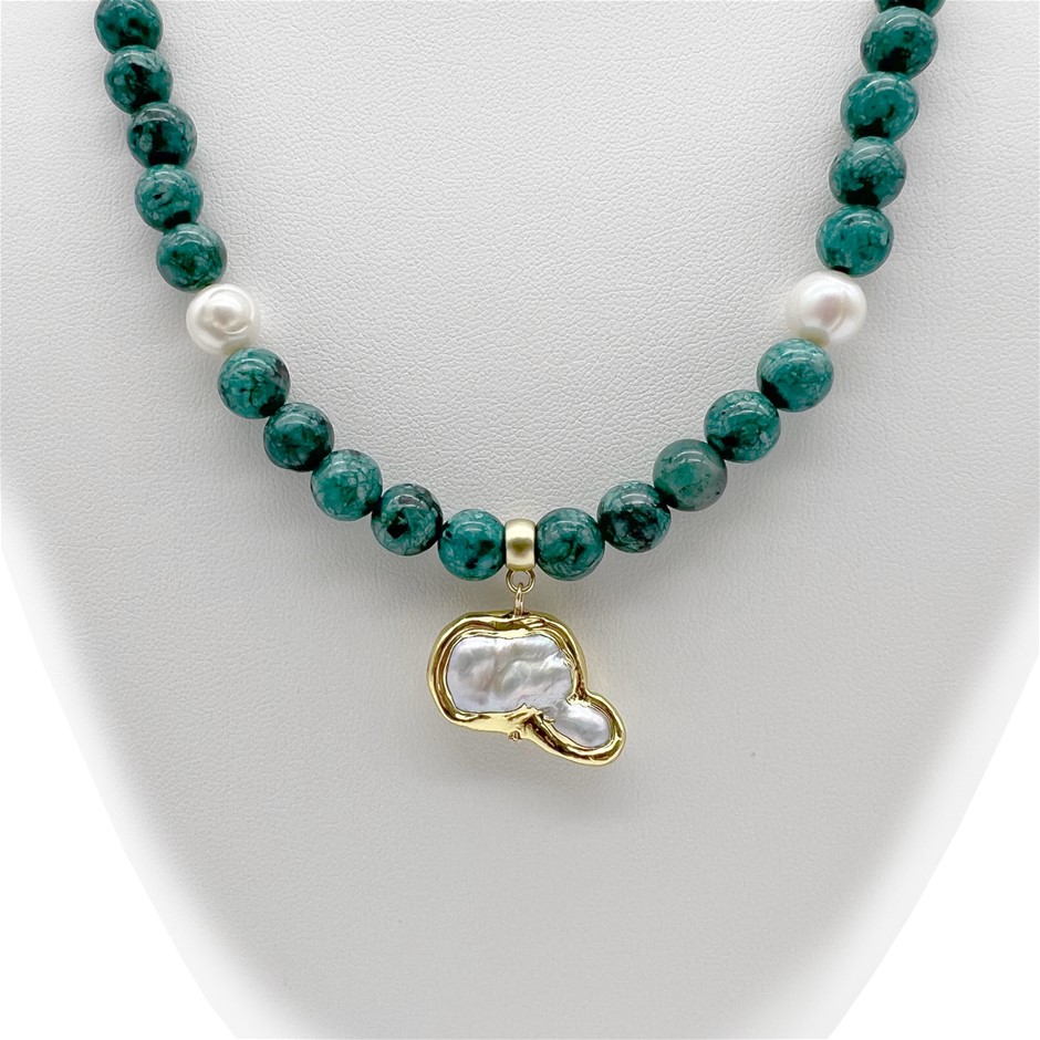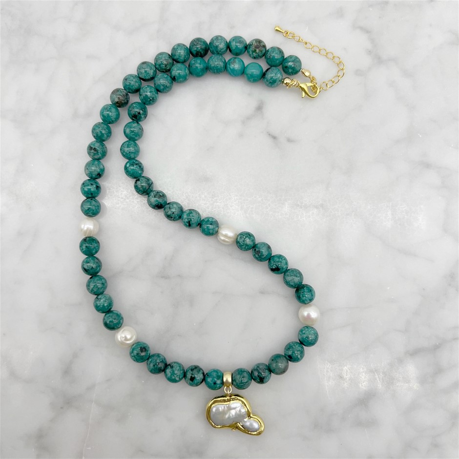 8mm Afican Jasper `Turquoise`, Baroque Pearl with Gold Trim & Button Pearl Pendant Charm Necklace. Product Specifications: