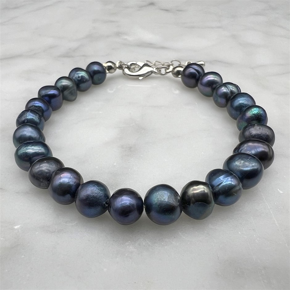 Natural 7-8mm Black Potato Shape Freshwater Pearl with Platinum Plated Bracelet