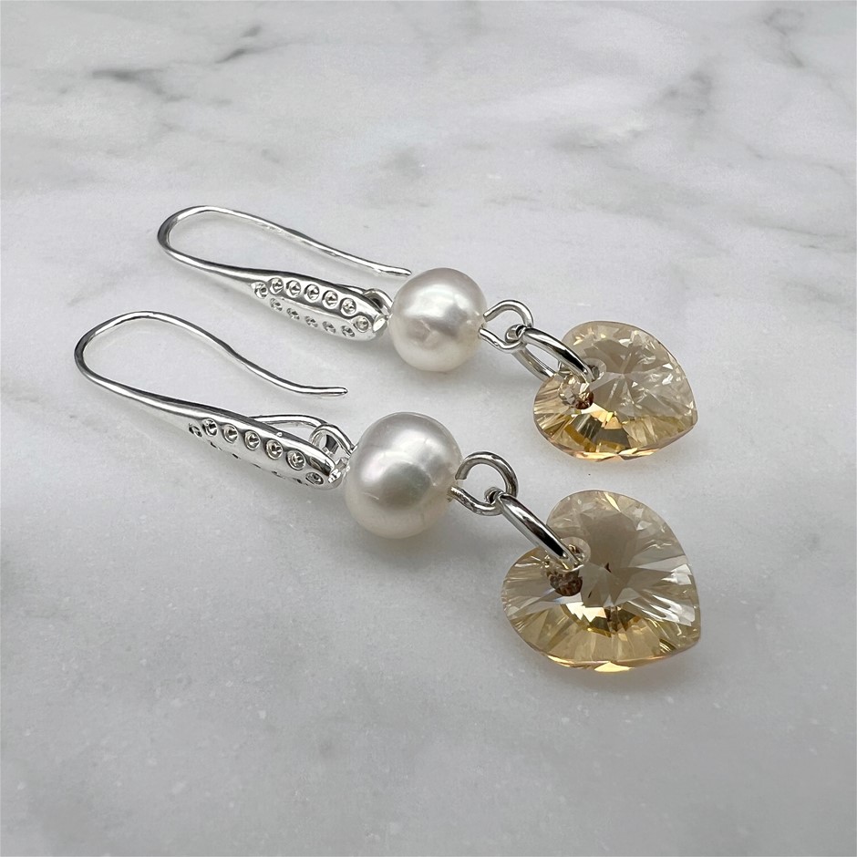 White Freshwater Pearl Adorned with Swarovski® Crystals Drop Earrings.