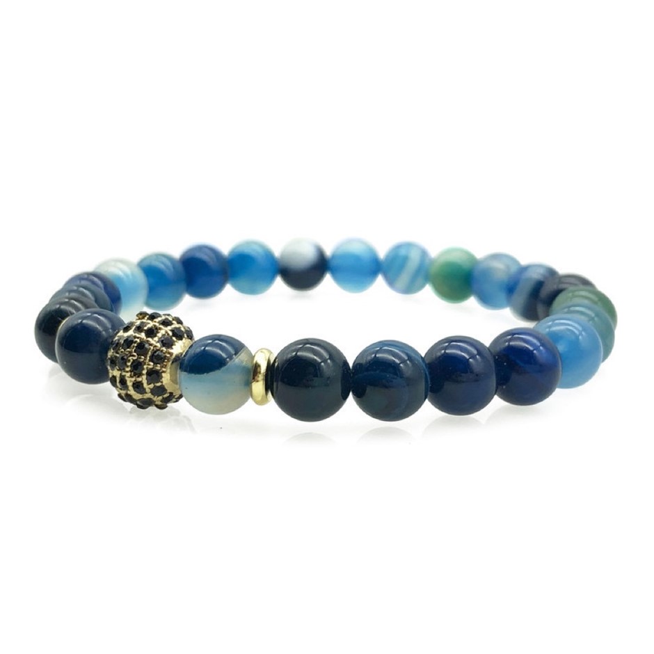 Men`s 8mm Blue Stripey Agate & Golden Rhinestone Beaded Gemstone Bracelet.