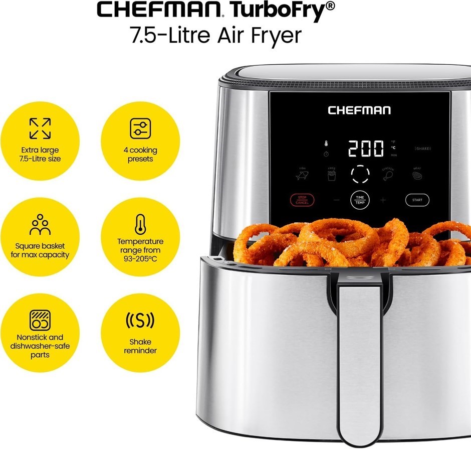 CHEFMAN TurboFry Touch Air Fryer, XL 7.5 Litre Family Size, 1800W Power, 4 Presets, Uses No Oil, Nonstick Dishwasher-Safe Parts, Automatic Shutoff, Stainless Steel. (Code: B0BWPW3BK4) (140291-39)