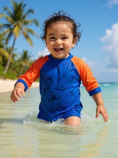 • Rash vest made with water reactive fabric. Purple body pink shoulder. Size 1