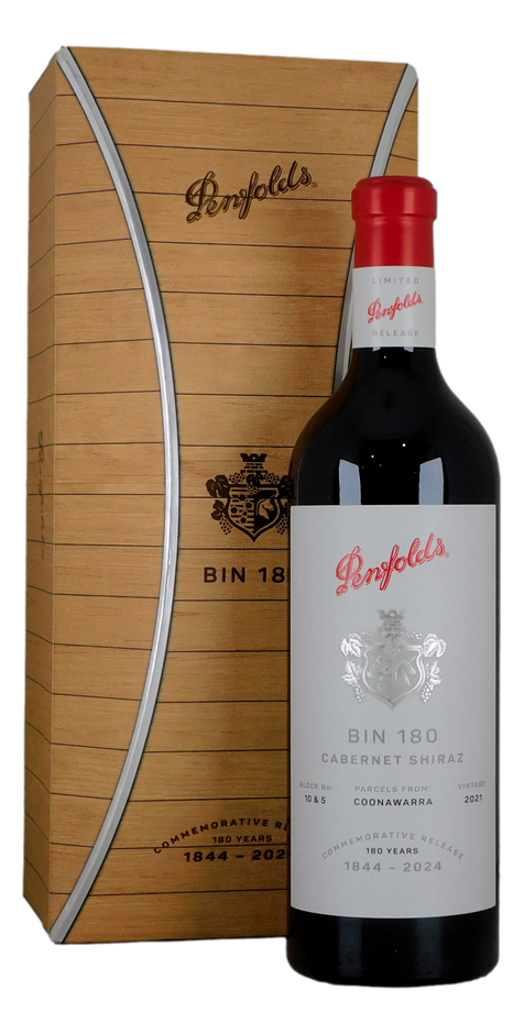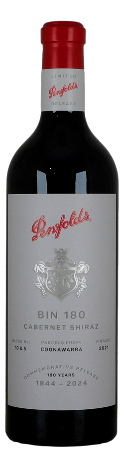 Penfolds Bin 180 Coonawarra Cabernet Shiraz 2021 binds the past and present. It encases progress, tradition, and spirit as a commemorative wine to mark 180 years of winemaking at Penfolds. Made with fruit from esteemed Penfolds vineyard blocks in Coonawarra, Bin 180 highlights the long-standing relationship between Penfolds and the region.