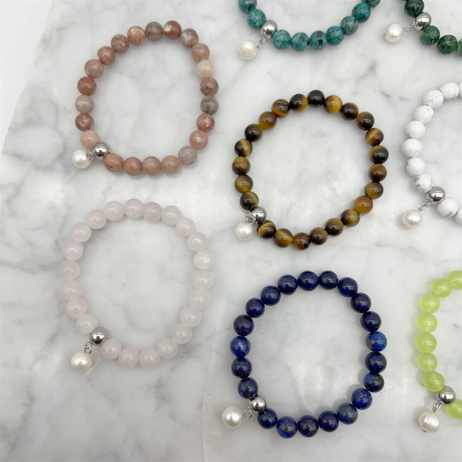 8mm Gemstone & Pearl Charm with Stainless Steel Bracelets - 10 Pcs