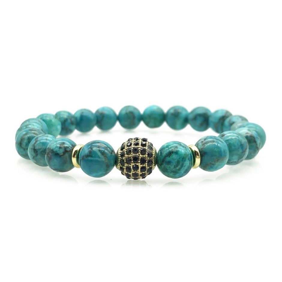 Men`s 8mm African Jasper `Turquoise` & Golden Rhinestone Beaded Gemstone Bracelet.