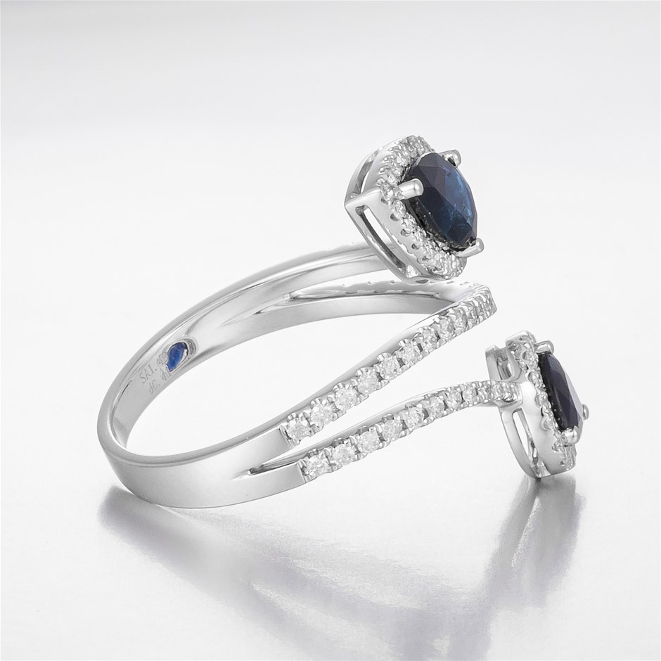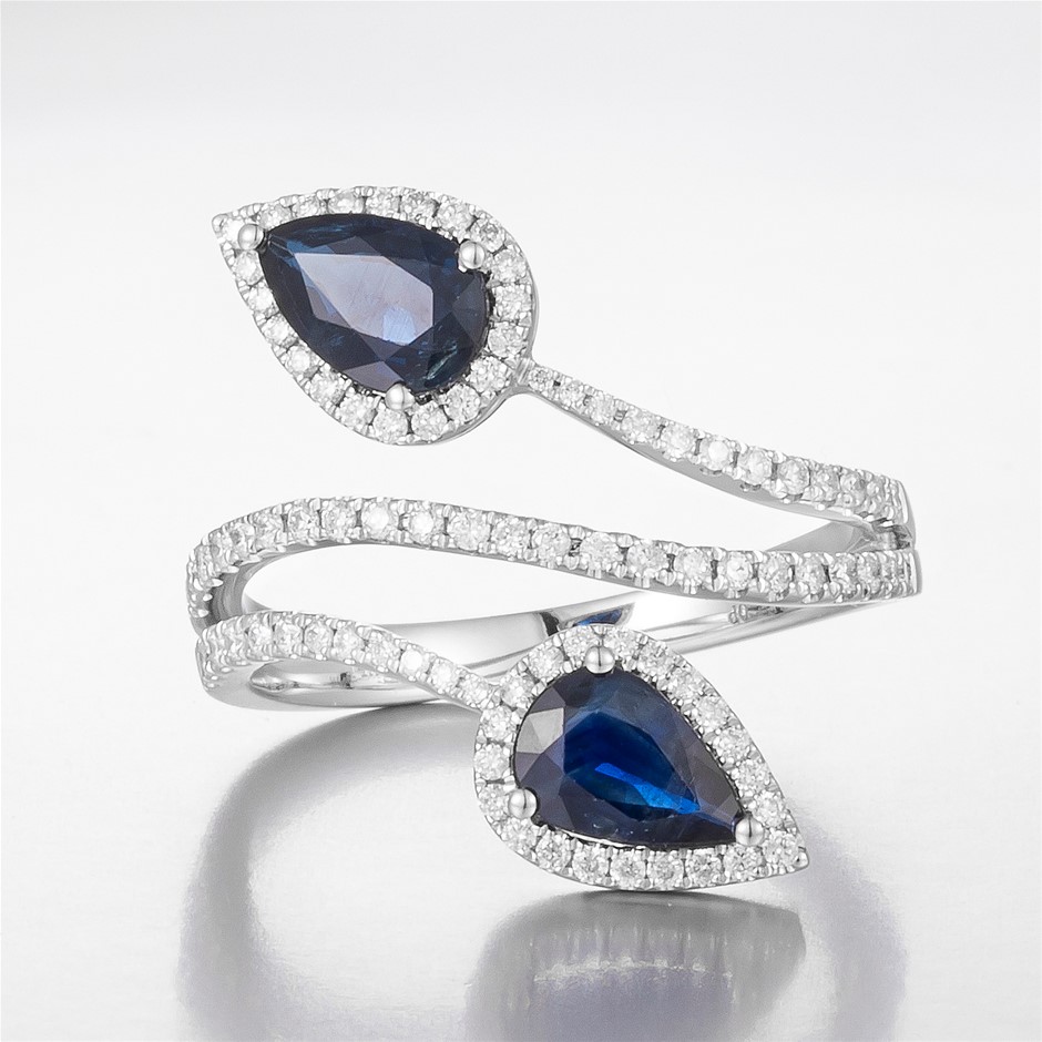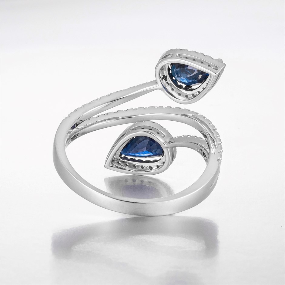 • Featuring centre, 2 pear cut, deep royal blue Australian Sapphires (1.49ct TSW, moderately included)