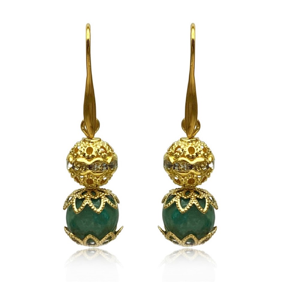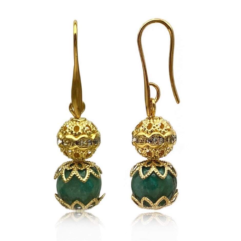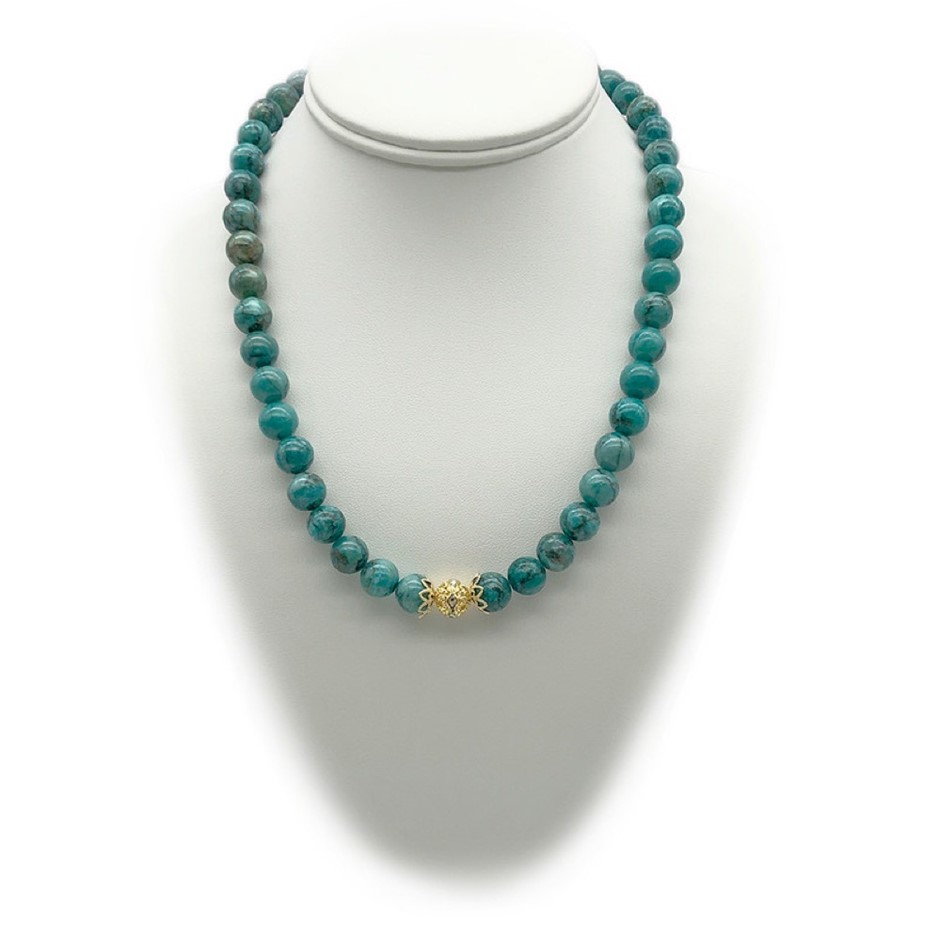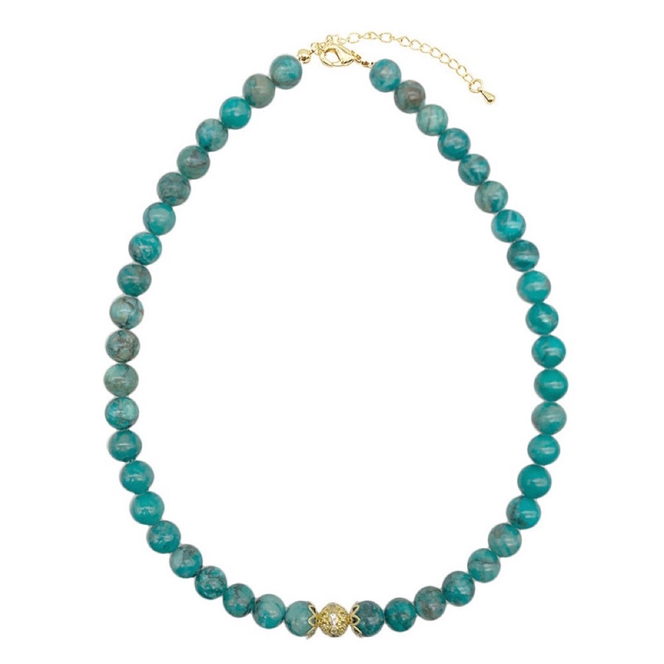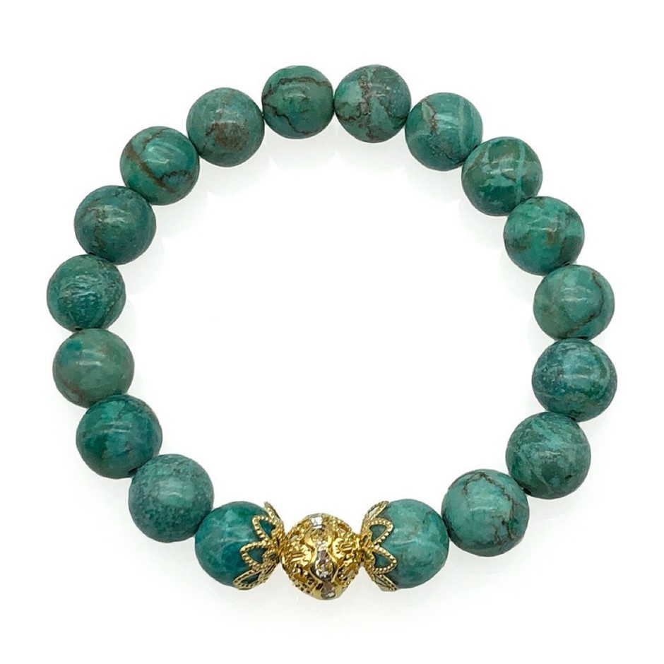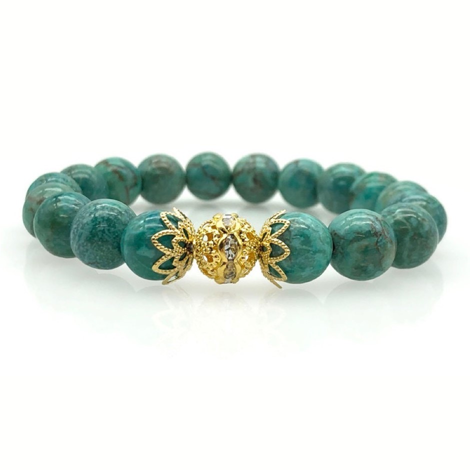 10mm Natural African Jasper Turquoise Persian Love Gold Plated Rhinestone Necklace, Bracelet & Earring Set.