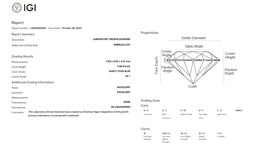 2.68 Carats Fancy Vivid Blue / VS1 Lab Grown Diamond - IGI Certified