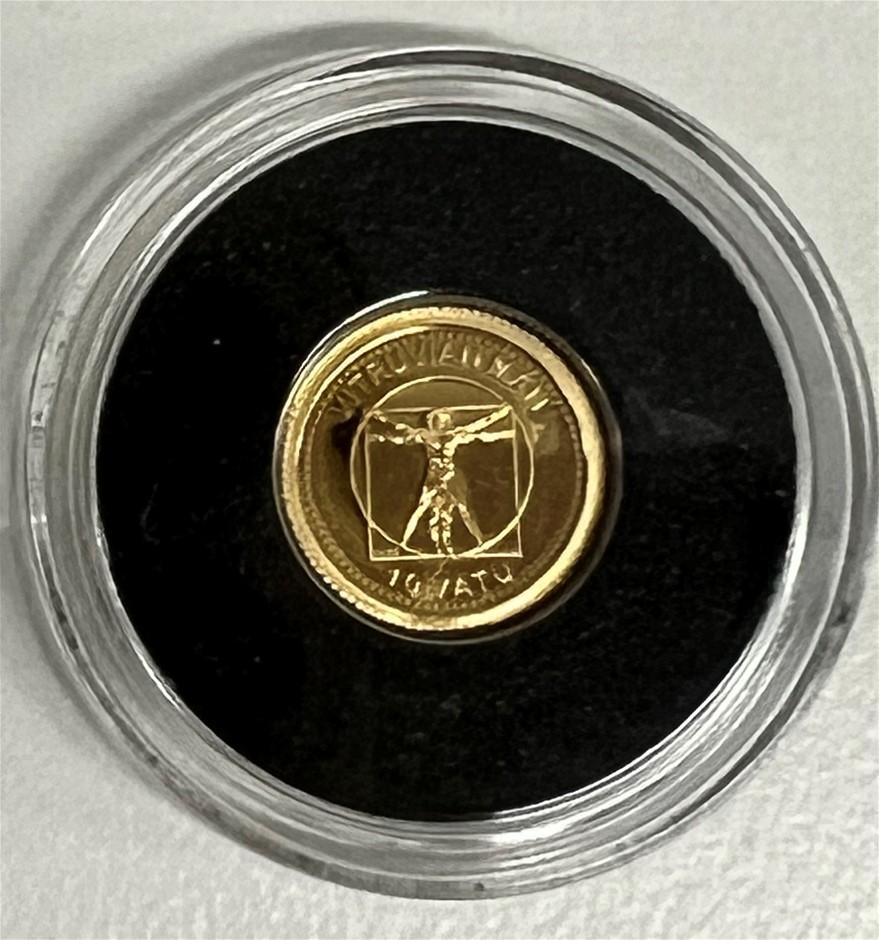 14ct yellow gold 0.5grams ``Vitruvian Man 10 Vatu`` Gold coin, plastic capsule
