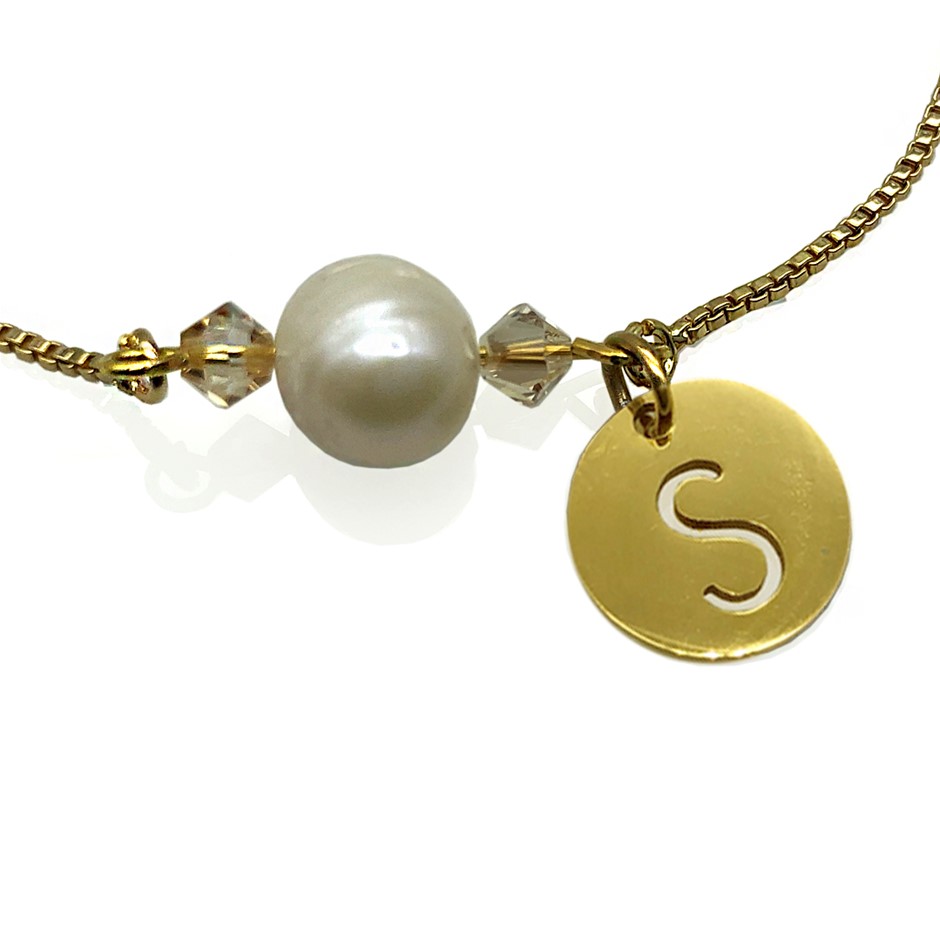 8-9mm Pearl & Swarovski Crystal & Initial Letter `S` Charm Real Gold Plated Chain with Adjustable Slider Bracelet.