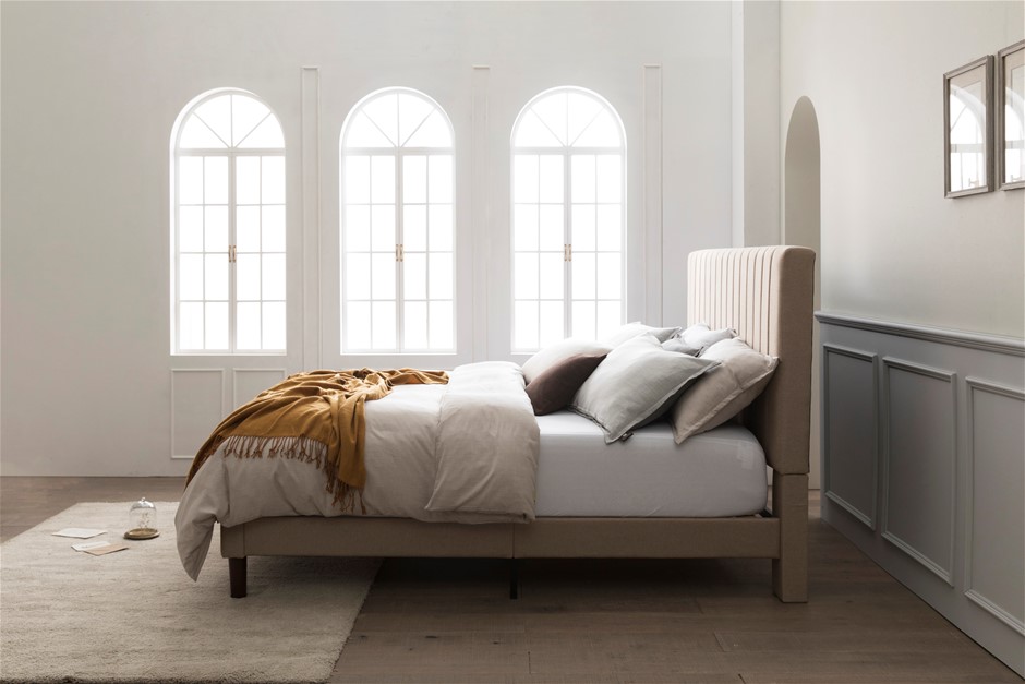 Infuse your personal style into the bedroom against the clean lines and neutral beige tone of the Debi upholstered platform bed by Zinus. Created with our wood slat foundation for reliable mattress support,this attractive design features a tall, foam cushioned headboard with channel stitching for a look that’s classic yet elevated. (SN:AU-FHVP-K) (292781-70)