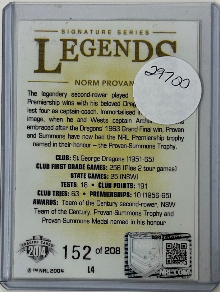 NRL 2014 Traders Signature Series Legends ``NORM PROVAN`` Signed Trading Card