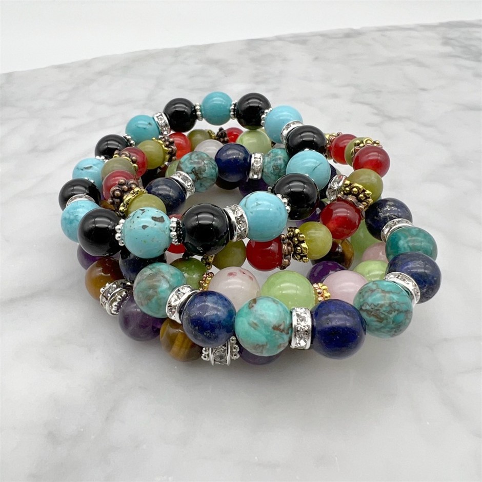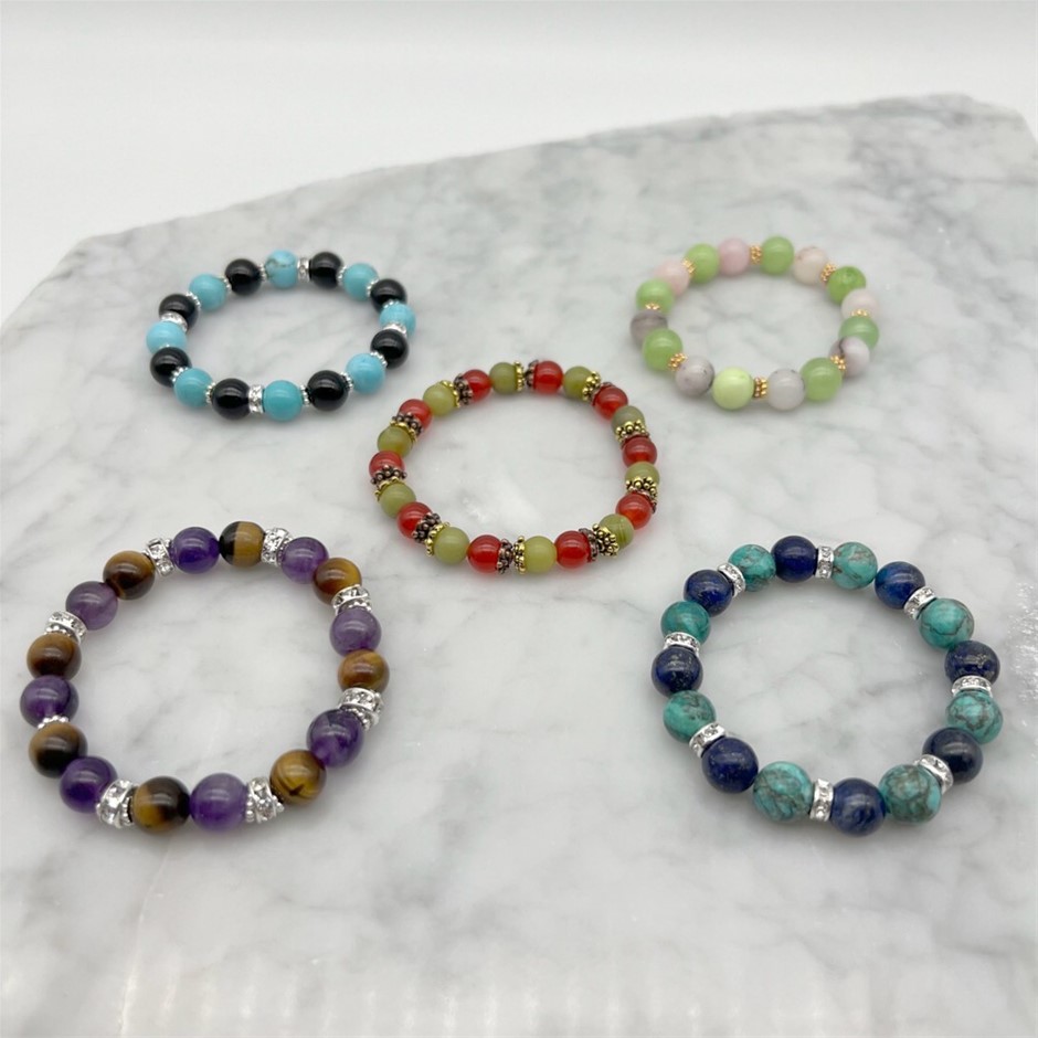 Exotic 8-10mm Gemstone & Rhinestone Spacer Stretch Beaded Bracelets - 5 Pcs