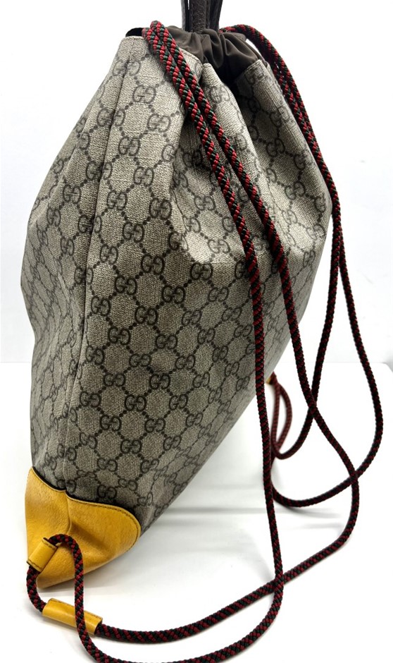 GG Monogram coated canvas with yellow & brown leather trim, 2 Brown leather top handles, Gold tone hardware, Drawstring closure, 1 Zip pocket, Measures 42 x 37 x 10cm, Made in Italy, Certificate of Authenticity (302839-41)
