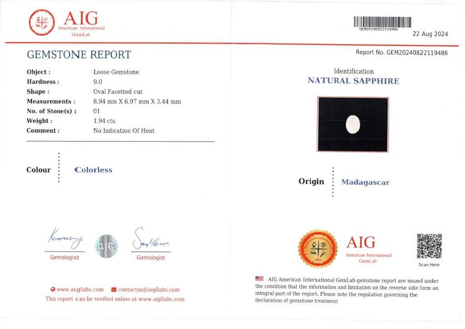 1.94 Carats Natural White Sapphire