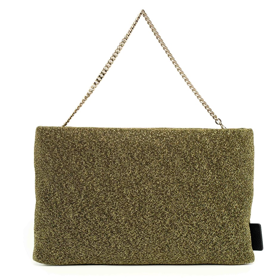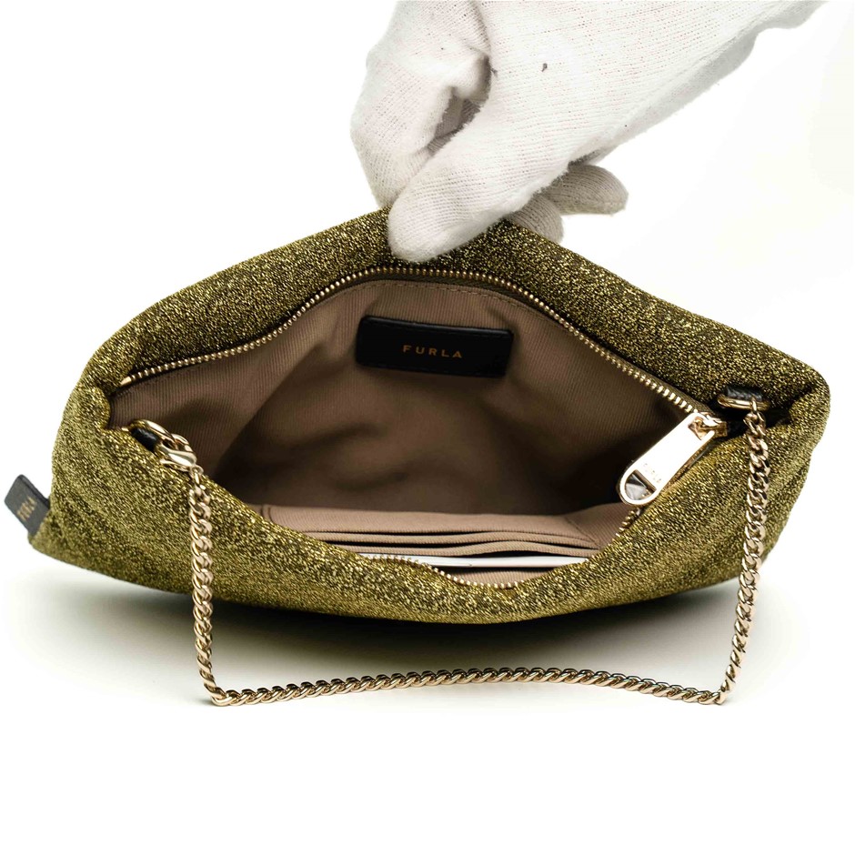 Furla Gold Glitter Chain Clutch Bag Featuring A Shimmering Metallic Fabric Exterior With A Sleek